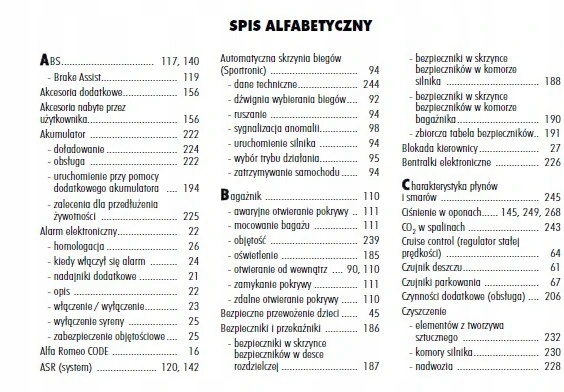 Руководство по эксплуатации Alfa Romeo содержит все версии оборудования и полезную информацию о том, как эффективно и безопасно использовать автомобиль, например: - индикаторы, контрольные лампы, открытие и закрытие - освещение и обзорность, сиденья, отсеки для хранения вещей, отопление, вентиляция, кондиционер - вождение, советы по эксплуатации, обслуживание автомобиля - уровни жидкостей, проверка и доливка, аварийные операции, замена колес, предохранители, замена лампочек - технические данные... и многое другое, дающее ощущение безопасности и комфорта. Польское законодательство обязывает продавца приложить к . Руководство пользователя автомобиля новое, на польском языке.