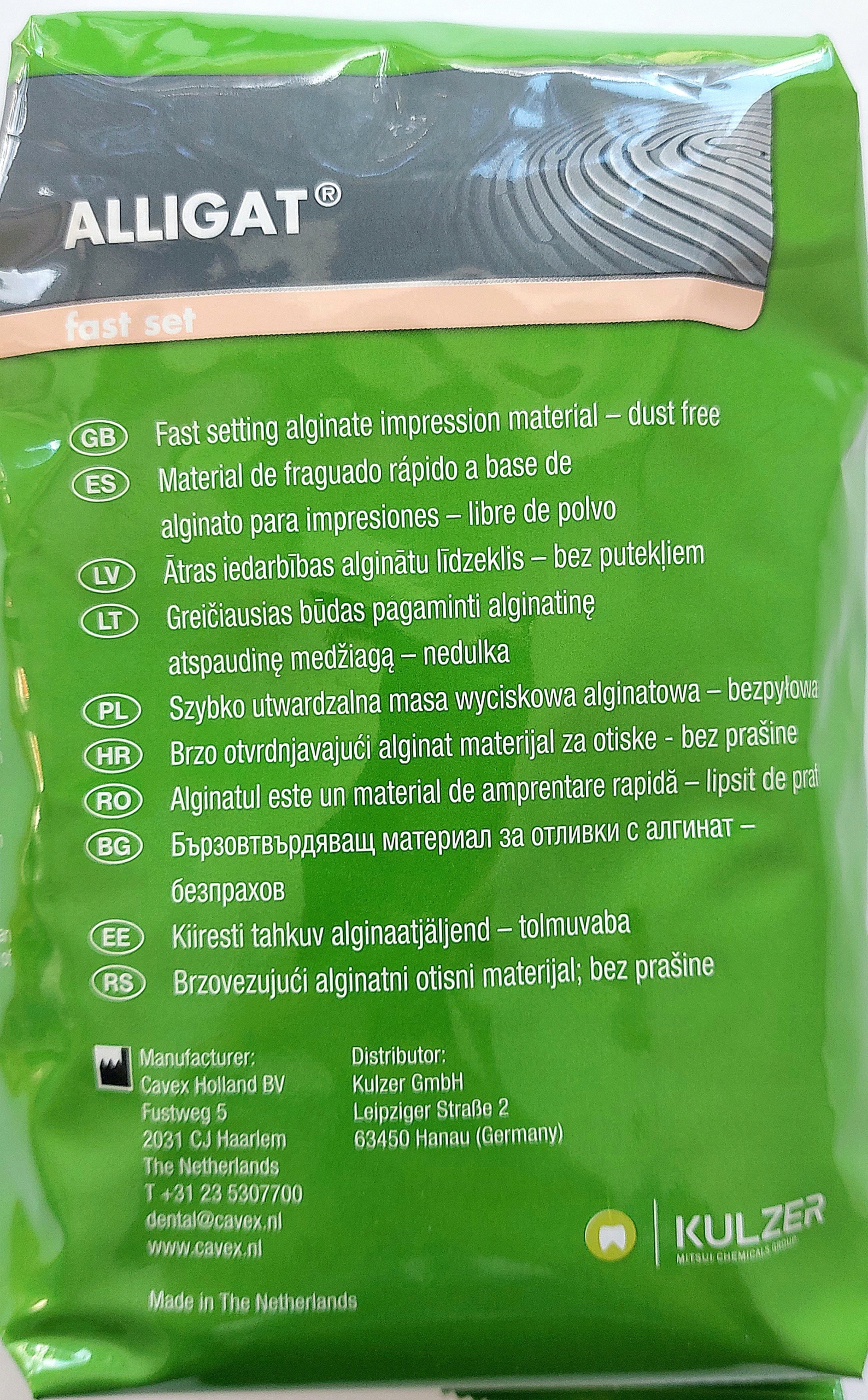 Alligat Chroma Fast Set – альгинатный оттискный материал с повышенным коэффициентом эластичности для изготовления двухслойных, одно- и двукратных оттисков. Он не содержит пыли и имеет увеличенное время схватывания. Высокая впитывающая способность позволяет получать непористые, пластичные оттиски. Оттискный материал, предложенный Кульцером, использовался в широком спектре техник протезирования. Его можно использовать для оттисков, как при полной беззубости, так и при частичном отсутствии зубов.