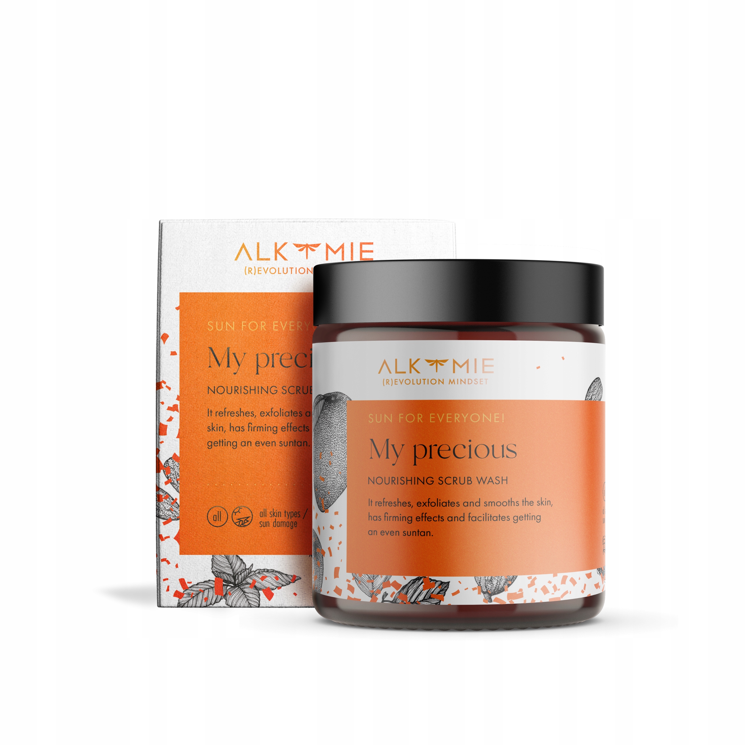 Alkmie Sun для всех Мой драгоценный питательный очищающий скраб для тела 200 г — нежный сахарный скраб для людей, которые заботятся о напитанной и упругой коже.