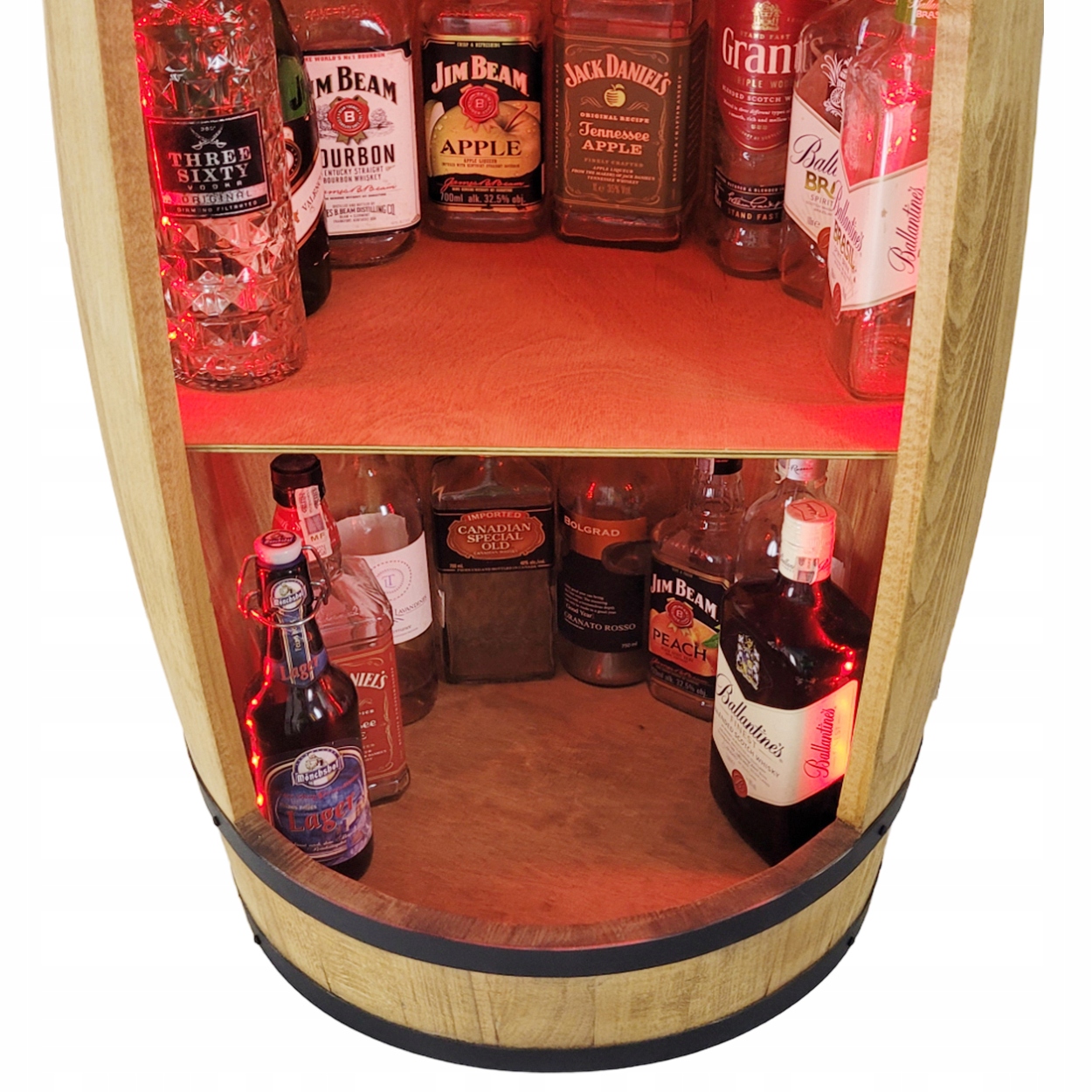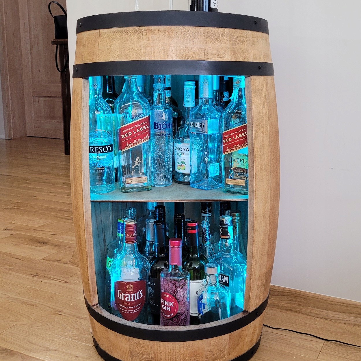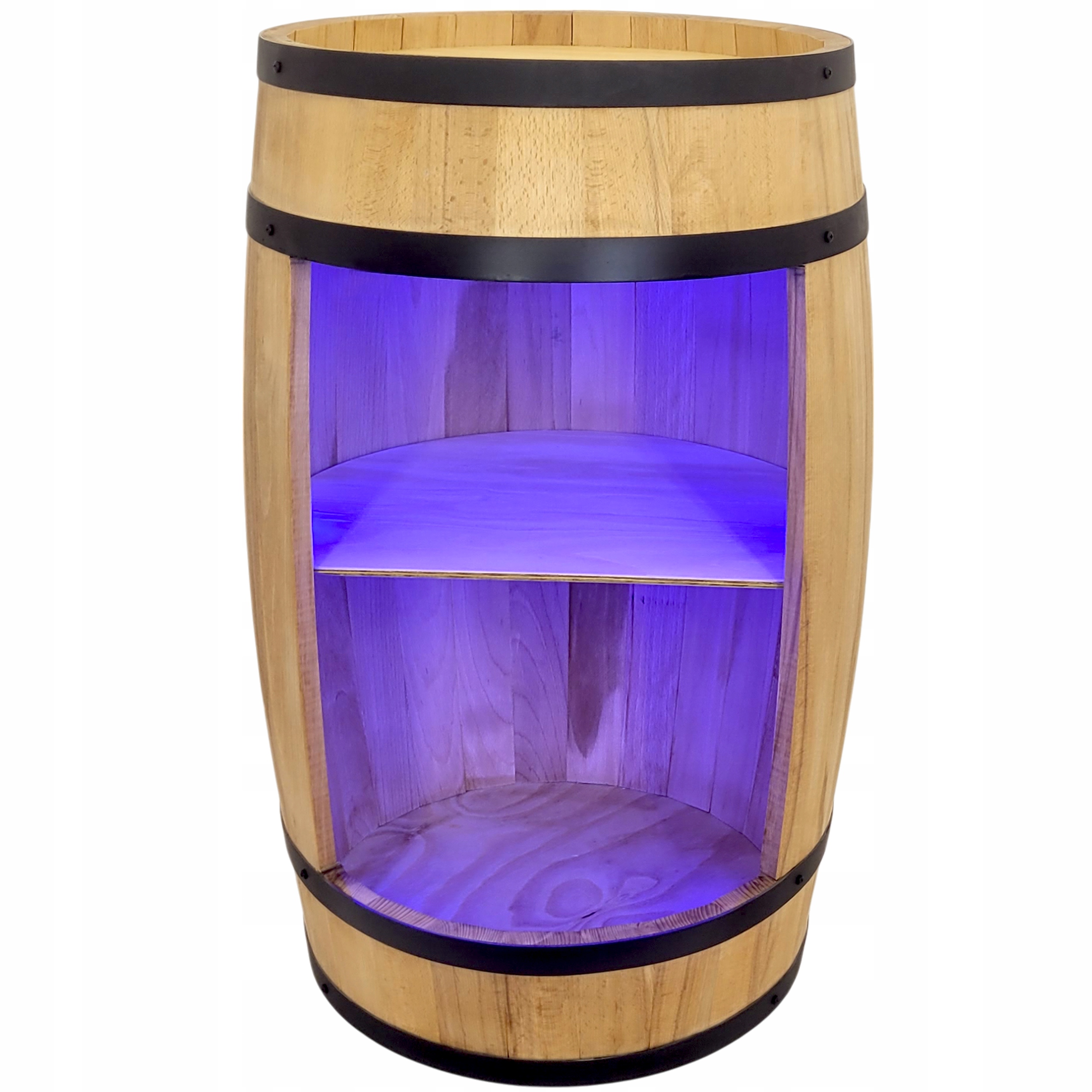 Деревянный бочко -домашний бар имеет монтированное светодиодное освещение RGB - цвет и яркость освещения контролируются с помощью дистанционного управления. Цвет освещения может быть адаптирован к настроению и атмосфере