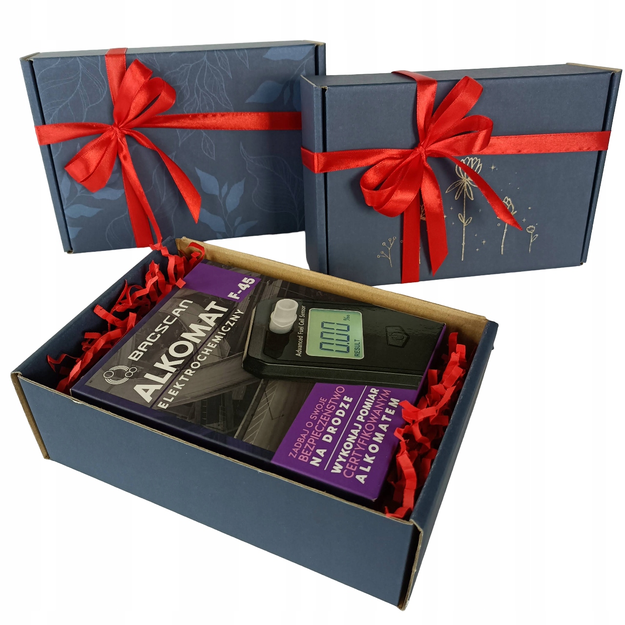 Подарочная коробка упакована в упаковку. с красной лентой. На коробке доступно два типа графики — цветочный или листовой мотив.
