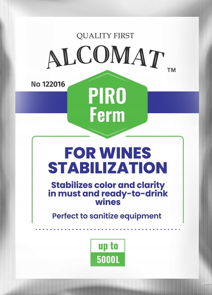 Alcomat PIRO Ferm — это продукт, широко используемый в винодельческой, пивоваренной и ликеро-водочной промышленности. Продукт предотвращает развитие неблагоприятной микрофлоры в сусле, подвергающемся брожению, и защищает винное оборудование от инфекций. Его дополнительным преимуществом является то, что он исключает присутствие диких дрожжей. Имеет вид белого кристаллического порошка.
