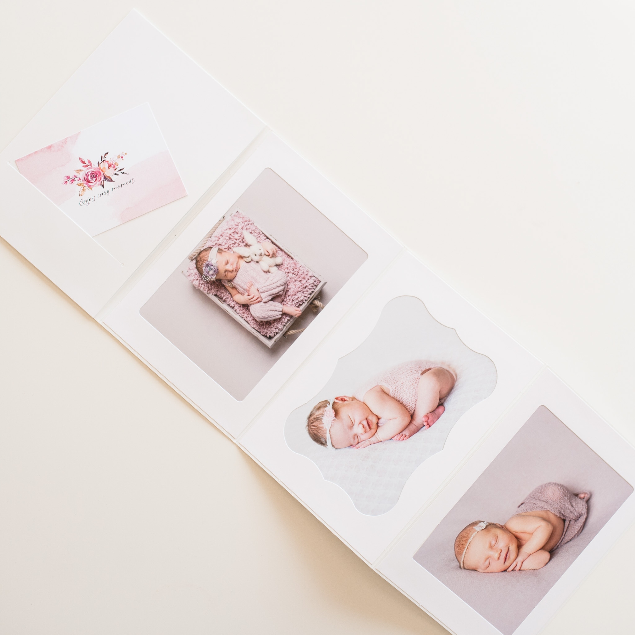 Ambumik изготовлен из гладкого картона и отличается элегантным дизайном с декоративным окном на обложке. Его интерьер имеет четыре сегмента, что обеспечивает гибкое расположение фотографий. Вы можете хранить в нем: