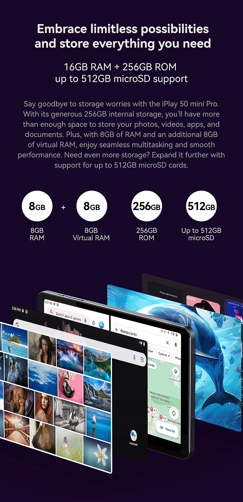 iPlay 50 Mini Pro оснащен 8 ГБ ОЗУ и дополнительными 8 ГБ виртуальной памяти для обеспечения правильная работа системы. Кроме того, встроенная память объемом 256 ГБ может полностью поддерживать все ваши приложения и мультимедийные потребности. Кроме того, поддержка карт TF/microSD объемом до 512 ГБ для увеличения памяти.