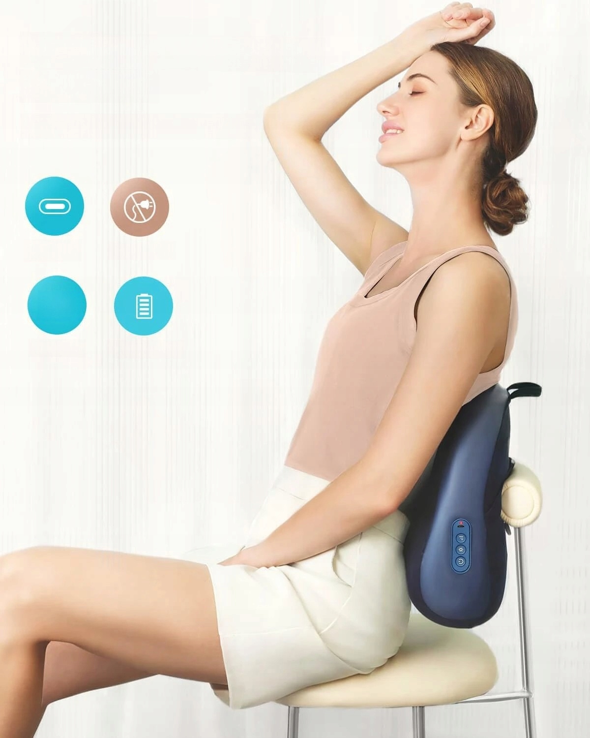 Беспроводной массажер шиацу ALLJOY — это функциональная и эргономичная массажная подушка, которая приносит облегчение усталым мышцам шеи, рук, спины, талии и ног. Оснащенный 4 вращающимися 3D-головками, он обеспечивает глубокий разминающий массаж, имитируя работу рук массажиста.