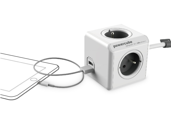 Удлинитель Allocacoc PowerCube, 4 розетки с двумя портами USB, серый, кабель 3 метра