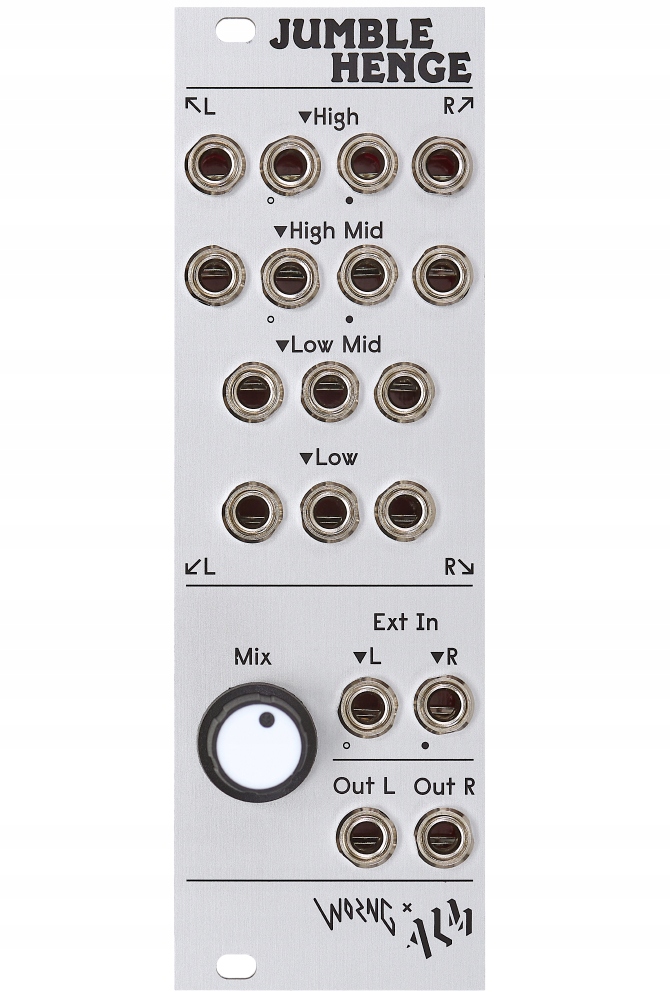 ALM/Busy Circuit Jumble Henge — это спектральный стереомикшер с 16 входами и уникальным интерфейсом микширования. Каждый вход имеет тщательно настроенный резонансный аналоговый фильтр и уникальное фиксированное значение панорамы, что дает каждому звуку свое собственное место в миксе. Имеется регулятор микшера для регулировки глубины фильтра и чистый внешний стереовход для подключения к другому микшеру или дополнительному источнику звука.