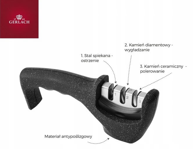 Точилка GRANITEX – практичный инструмент, который идеально подходит для заточки ножей с лезвиями из нержавеющей стали. Его исключительно удобная ручка изготовлена из приятного на ощупь материала с сатиновой отделкой, что обеспечивает комфорт во время использования. Кроме того, нескользящий материал, используемый в основании точилки, гарантирует безопасность при заточке. Однако стоит помнить, что точилку Gerlach Granitex 3 в 1 нельзя мыть в посудомоечной машине, чтобы дольше сохранить ее долговечность и функциональность.