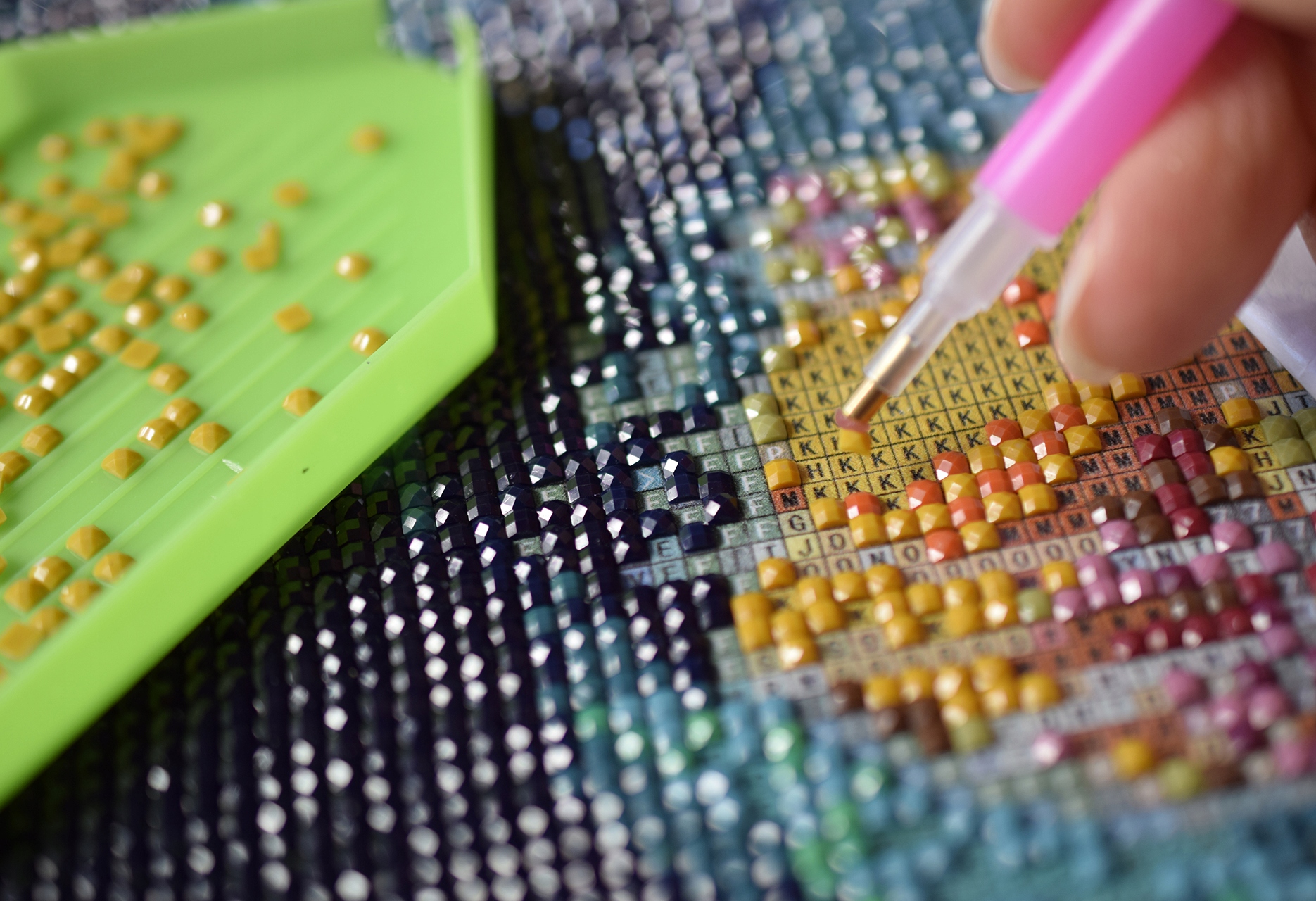 У ручки есть специальный продольный кончик на спинке, благодаря которому мы можем одновременно взять несколько бусин и выстроить полоску ромбов одного цвета. Очень полезный гаджет, когда у вас есть много бриллиантов одного цвета, которые можно разместить рядом друг с другом. Этот совет существенно ускоряет процесс расположения бисерин в один ряд.
