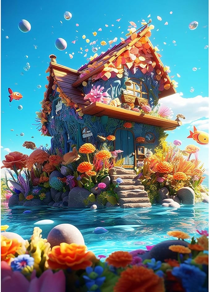 ✅Картина с изображением сказочной сцены красочный дом у воды, окруженный цветами и плавающими элементами, такими как лепестки и пузыри.