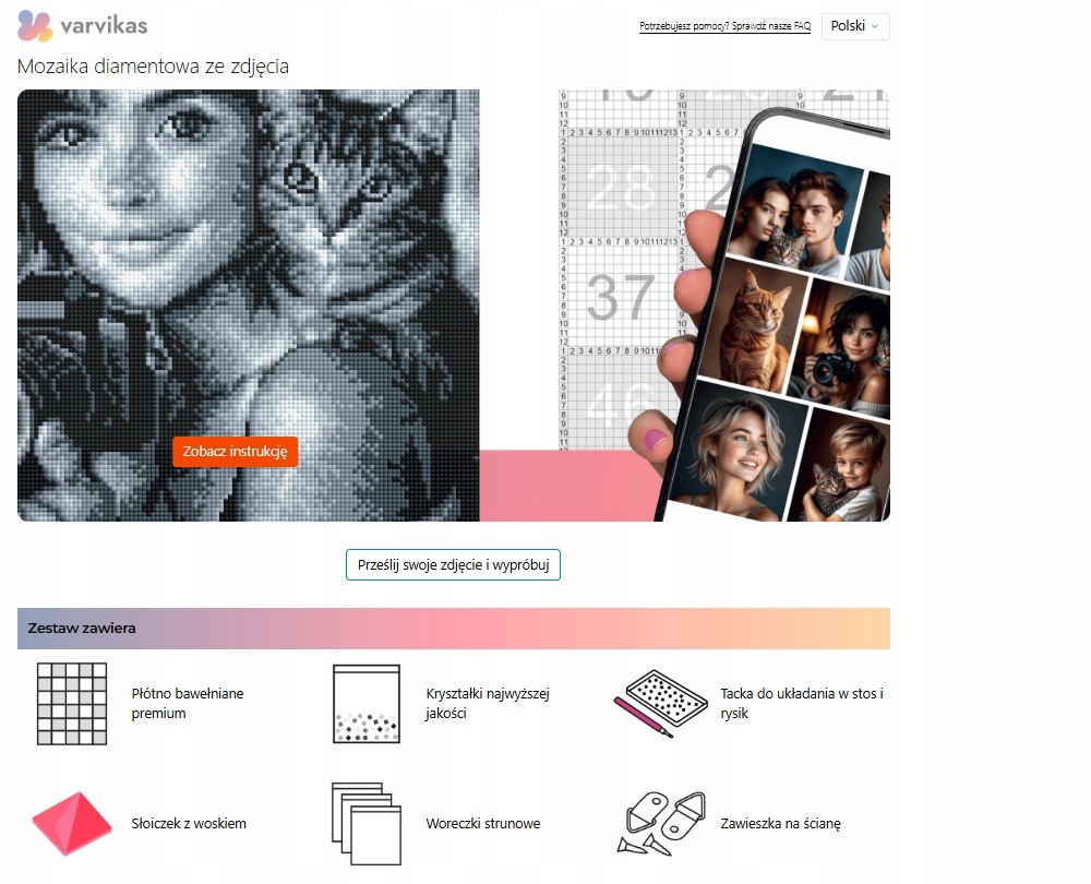 Вы заказываете набор на Аллегро — внутри вы найдете полотно, все необходимые элементы для оклейки и уникальный код доступа. Все, что вам нужно сделать, это загрузить свою фотографию прямо сейчас на https://dp.varvikas.com/pl, выбрать лучший вариант изображения и понравившейся схемы, а после получения набора скачать готовую схему с кодом.