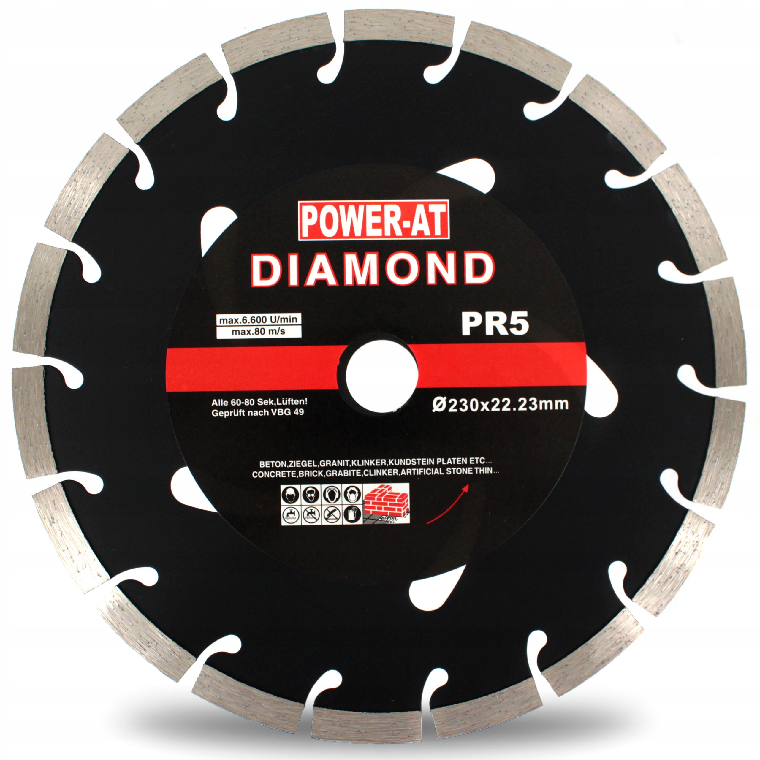 Алмазный диск POWER-AT, диаметр 230мм, для обработки строительных материалов: бетон, кирпич, брусчатка, клинкер, газобетон, керамическая плитка. Профессиональный алмазный отрезной диск с лазерной сваркой. Разработан для сухой работы в угловых шлифовальных машинах.