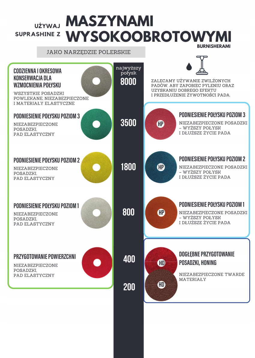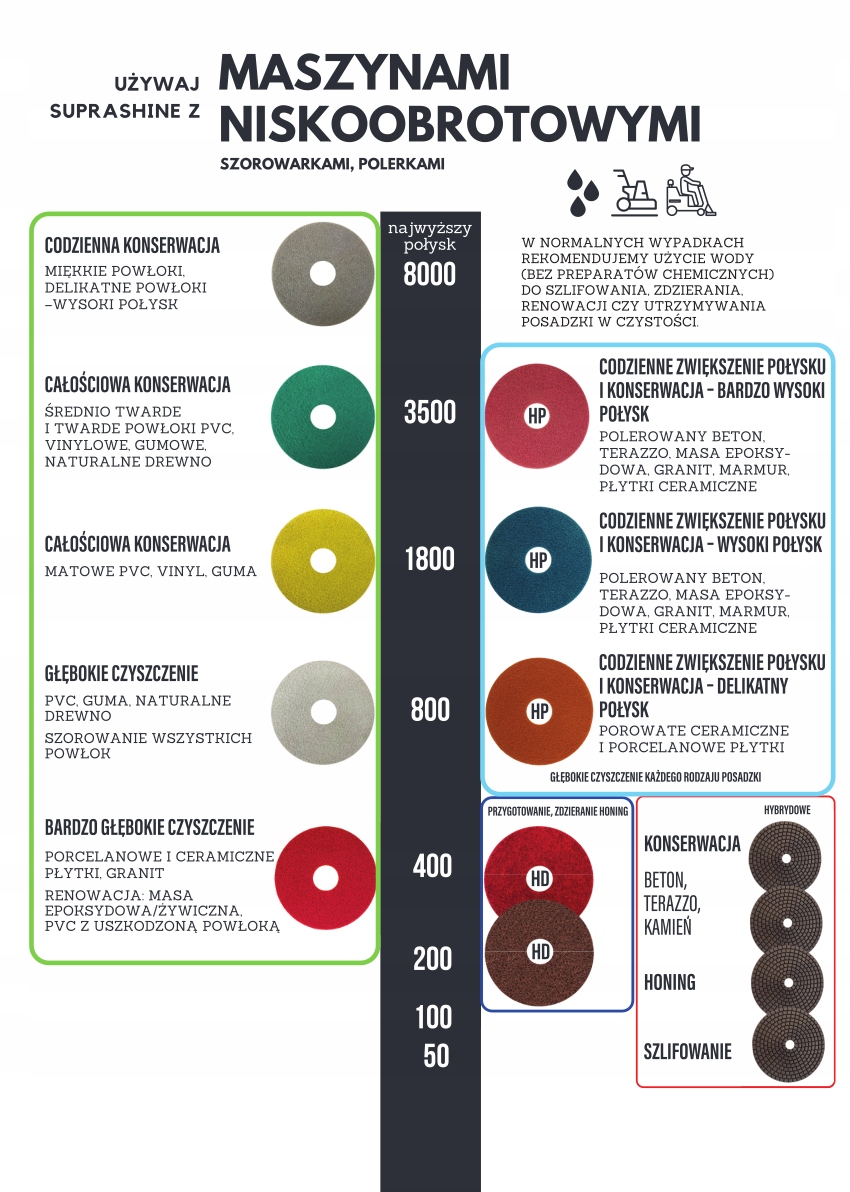 SupraShine Diamond Pads — это подушечки, которые будут использоваться в поломоечных машинах, промышленные моечные и полировальные машины высокой скорости. С их помощью можно очистить как бетонные, так и каменные полы и придать им больший блеск при небольших затратах.