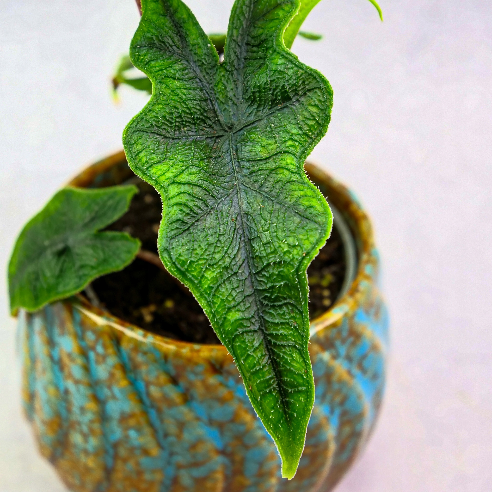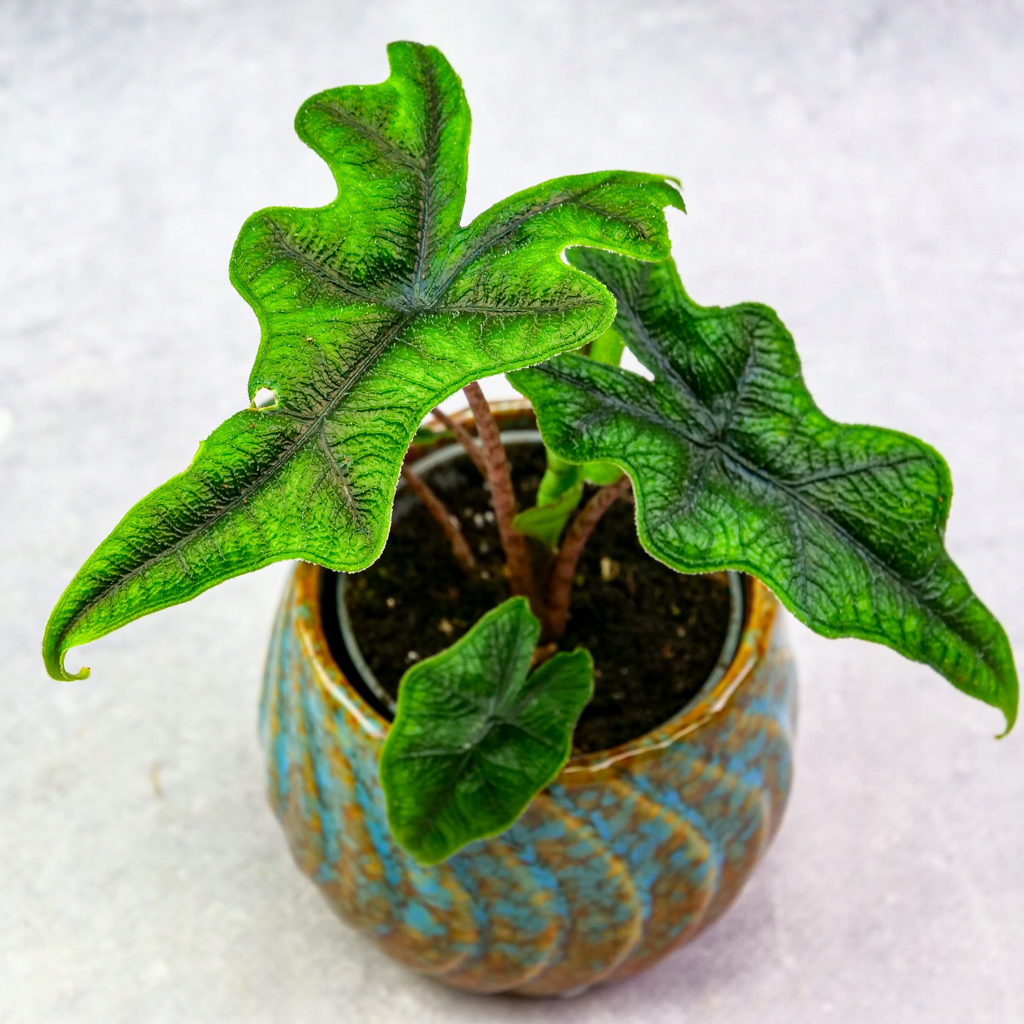 Алоказия Джеклин – необычная алоказия, листья которой имеют треугольную форму. Они порадуют вас своей структурой и цветом и пользуются большим спросом у любителей коллекционных растений. Его стебель, пятнистый, как у Алоказии Зебрина, добавляет ему очарования.