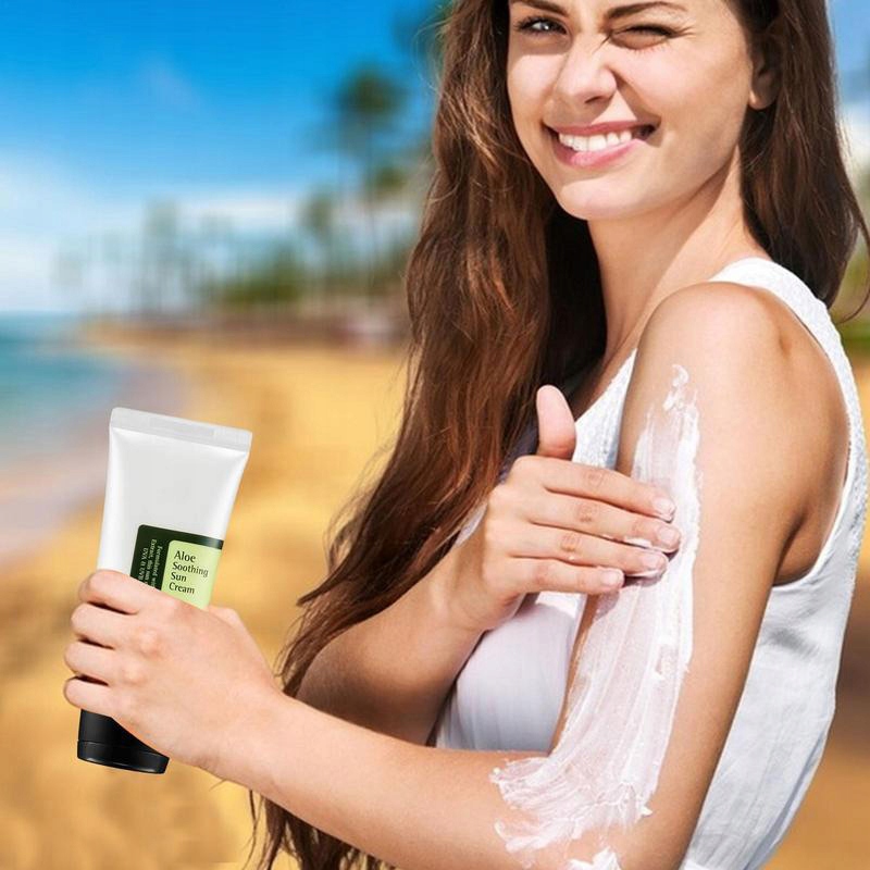 Успокаивающий солнцезащитный крем с алоэ — это ежедневный солнцезащитный крем, содержащий экстракт листьев алоэ и блокирующий ультрафиолетовые лучи, ухаживая за сухой кожей.