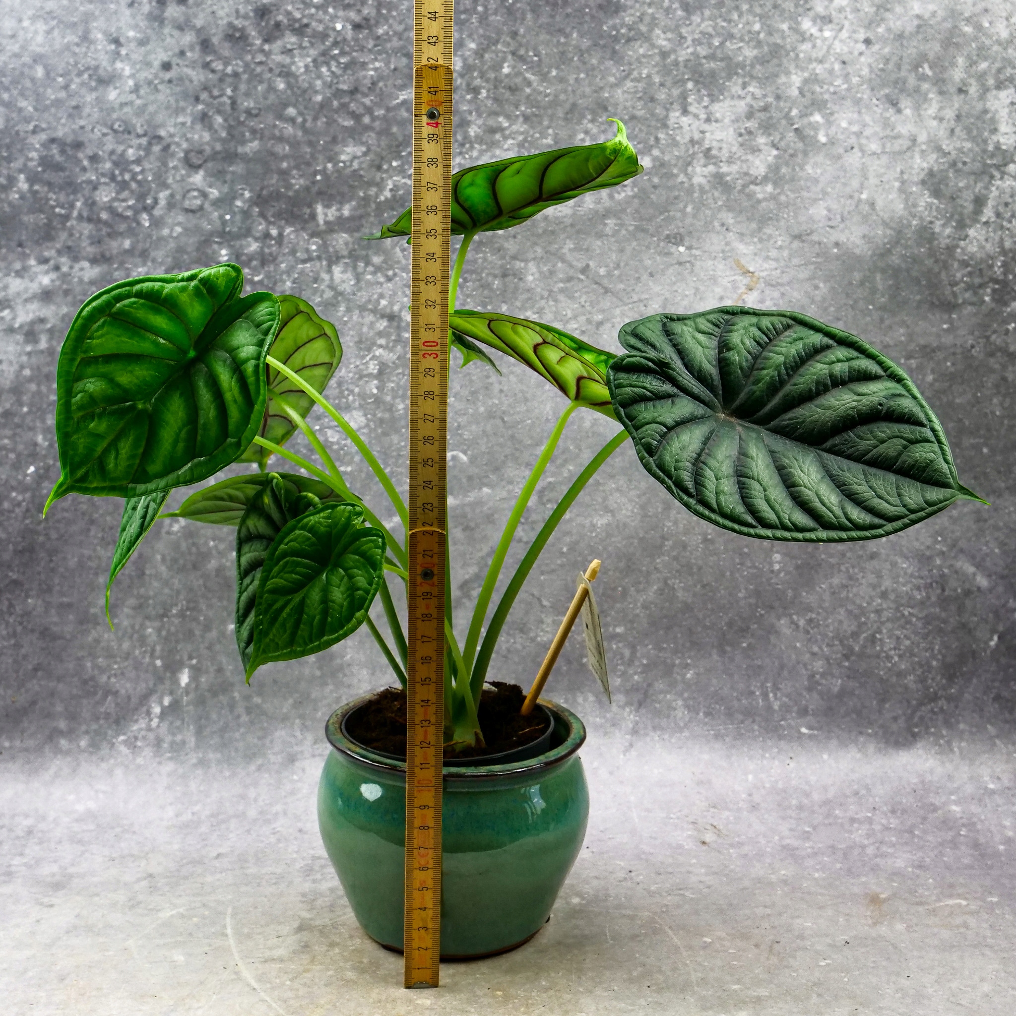 Алоказия Серебряный Дракон отличается интересной окраской листьев: листья серебристо-зеленые, мясистые.