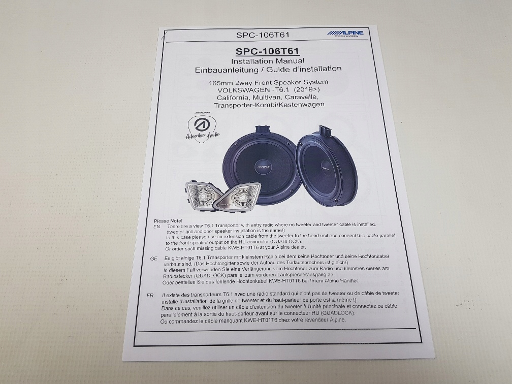 Компоненты системы альпийских динамиков используют только оригинальные места сборки, чтобы облегчить установку и сохранить возможность снова установить заводскую систему (если вы управляете лизинговым транспортным средством, которое должно быть возвращено в какой -то момент). Все разъемы совместимы с исходным пучком проводов и разъемы VW в режиме подключаемой игры. Вся установка может быть сделана за короткое время, используя обычные домашние инструменты. Набор включает в себя инструкции по сбору шага -шаг.