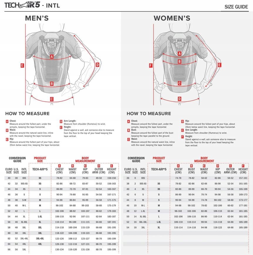 (1*) Жилет Alpinestars Tech-Air® 5 был разработан для того, чтобы носить под любым хорошо подготовленной текстильной курткой, помня, что куртка должна быть достаточно большой, чтобы приспособиться к росту подушка безопасности в случае аварии. В случае текстильных курток для этого требуется дополнительное пространство 4 см вокруг окружности тела. Tech-Air® 5 также можно носить с кожаными куртками, совместимыми с Tech-Air®, которые имеют встроенные панели расширения кожи для размещения надувной подушки безопасности. Мотоциклисты, которые хотят носить кожаную куртку из других брендов, которые не совместимы с Tech-Air®, должны убедиться, что в куртке есть дополнительное пространство 4 см вокруг окружности всего сундука *) Система подушек Tech-Air® 5 Air предлагает ту же защиту, что и 18 CE 1, защитные защитники, подтвержденные SGS, официально CE CER Certifing Company, которая предоставляет независимый тест на соответствие требованиям продукта с европейскими правилами личной защиты