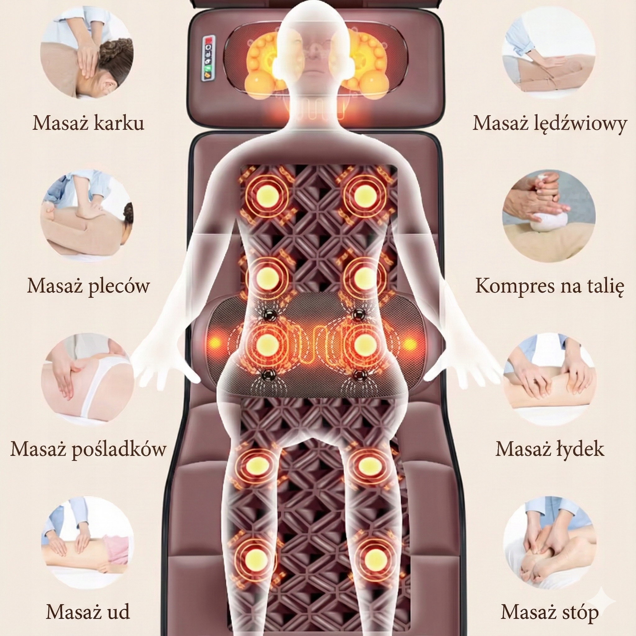 ✅ Функция успокаивающего нагрева 🔥 Коврик имеет функцию горячего сжатия. Тепло проникает глубоко в мышцы, ускоряя их регенерацию, улучшая кровообращение и усиливая ощущение расслабления. Идеально подходит для холодных вечеров!
