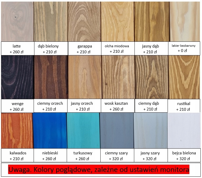 - сосна ( видно на фото): натуральный цвет древесины сосны, окрашенный двойным слоем бесцветного лака (полуматовый). В стоимость кровати входит ольха медовая, дуб беленый, гараппа, дуб светлый, орех темный, орех светлый, дуб темный, рустикал, кальвадос - натуральная древесина сосны, окрашенная в определенный цвет, покрытая двойным слоем прозрачного лака (полу- матовый). При выборе этого цвета к цене кровати добавляется дополнительно 210 злотых.