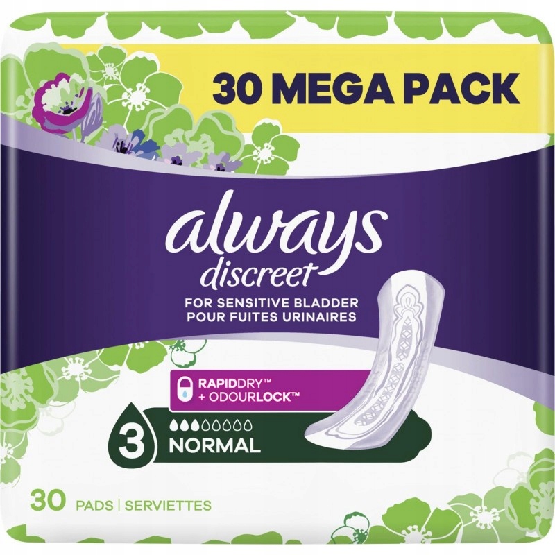 Всегда осторожно в случае недержания мочи и легкого кровотечения. Благодаря гигиеническим прокладкам ALWAYS DISCREET Normal защита от периодического непроизвольного мочеиспускания больше не является проблемой.