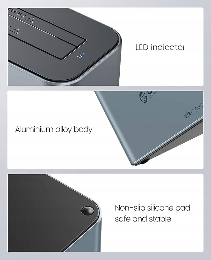 Высококлассный алюминиевый сплавORICO изготовлен из прочного и долговечного алюминиевого сплава с вертикальной структурой, обеспечивающей высокую эффективность и быстрый отвод тепла. Пылезащитная крышка разъема всегда обеспечивает чистоту и безопасность док-станции. Светодиодный дисплей позволяет легко распознавать рабочее состояние.