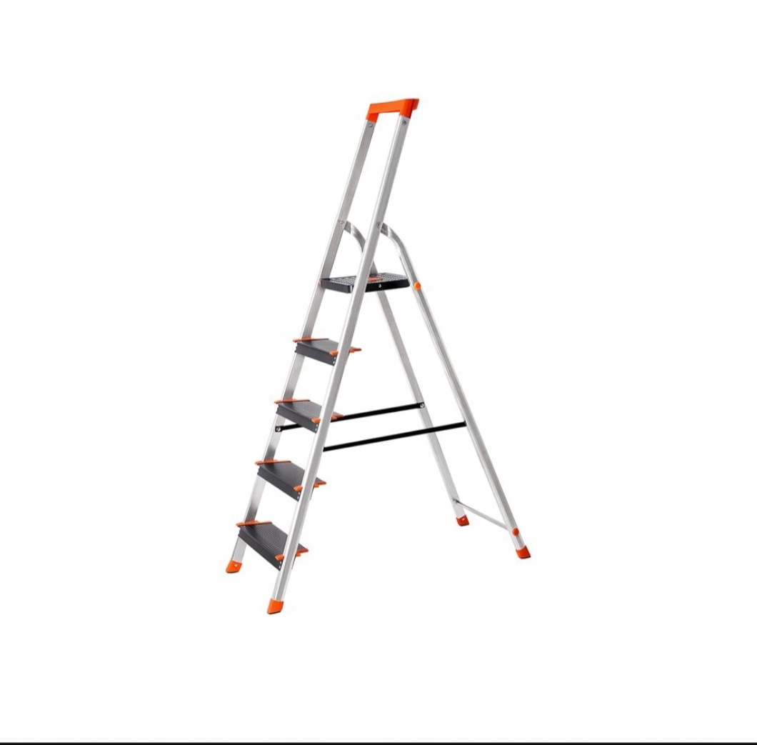 - ЧТО ВЫ ПОЛУЧАЕТЕ — 5-ступенчатая алюминиевая лестница изготовлена из алюминия и универсальна. Серые алюминиевые ступени, оранжевые пластиковые элементы – не только нержавеющие, но и стильные.