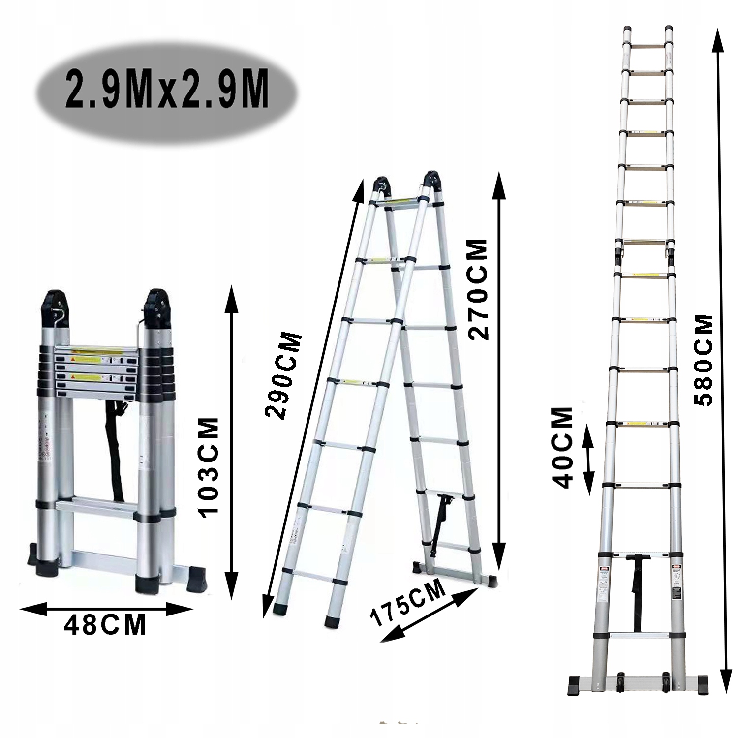 Алюминиевую лестницу 2 в 1 можно использовать как лестницу типа А, прямую лестницу, телескопическую лестницу и лестницу. Лестница типа А имеет высоту 2,9+2,9 м, а прямая лестница имеет высоту до 5,8 м, что идеально подходит для использования внутри и снаружи помещений.