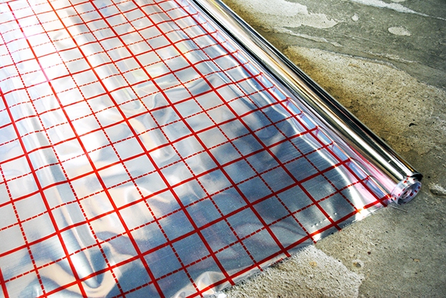 Фольга предназначена для защиты полистирольных плит от проникновения влаги, содержащейся в бетонной массе, а также самой бетонной массы при устройстве стяжки. Кроме того, пленка поддерживает пенополистирольные плиты, обеспечивая правильное крепление монтажных зажимов к трубам теплого пола.