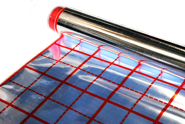 На верхней стороне фольги имеется принт в виде непрерывных линий, образующих сетку 10 см, и прерывистых линий, образующих сетку 5 см, способствующих правильному расположению на ней труб отопления.