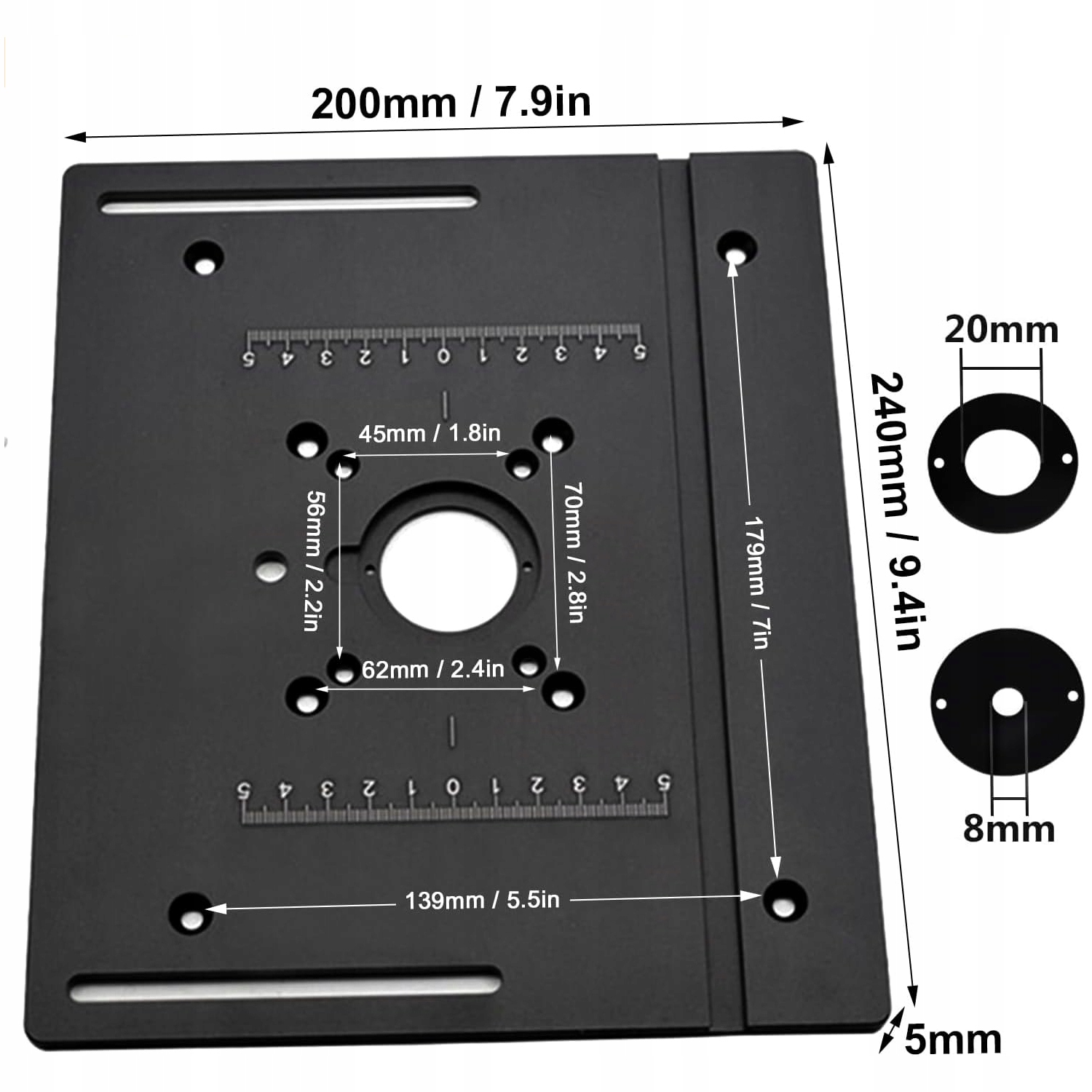 - Вставная пластина фрезерного шаблона имеет размеры 200 x 240 мм / 7,9 x 9,4 дюйма и подходит для большинства электрических торцовочных и гравировальных станков.