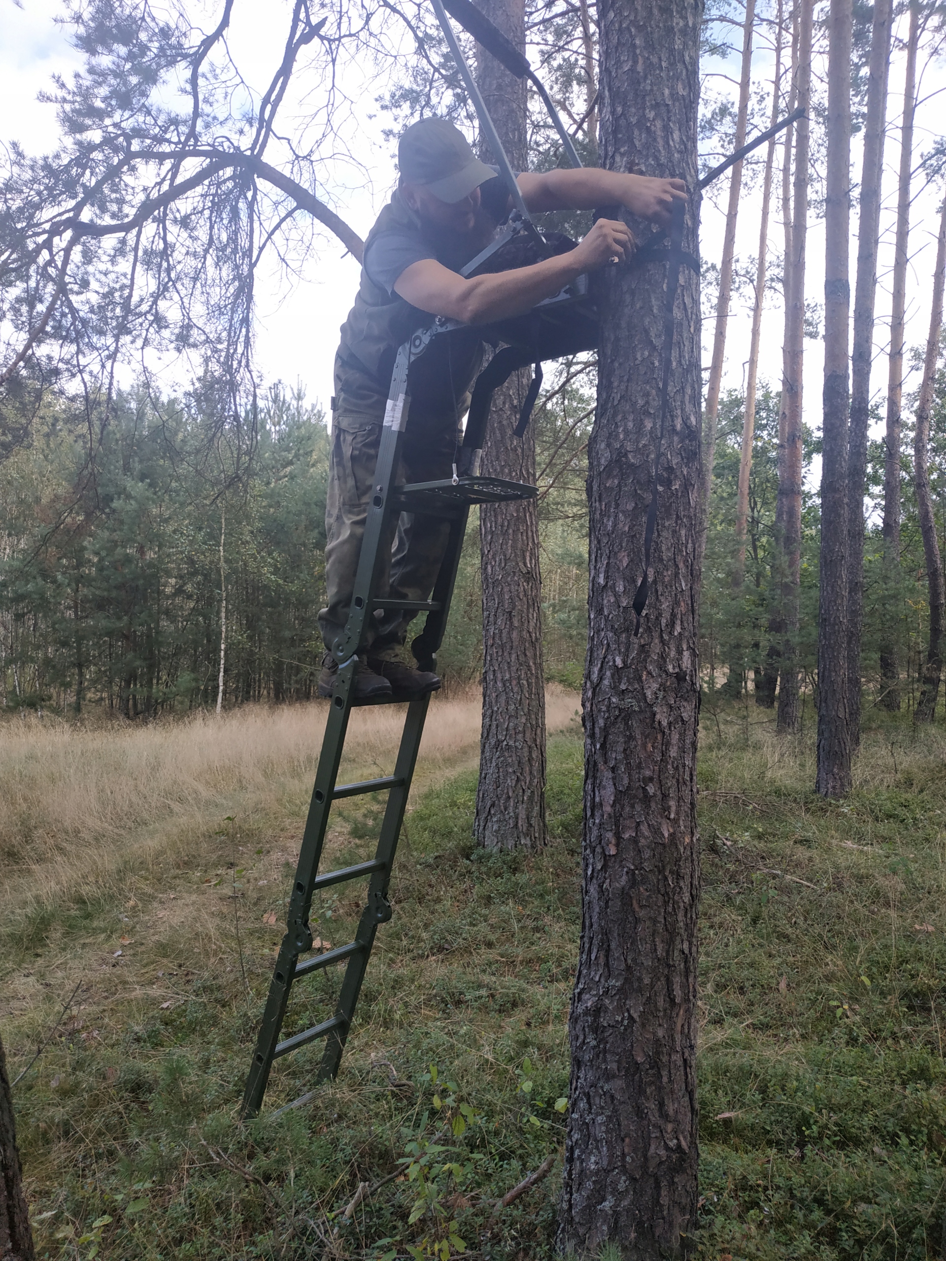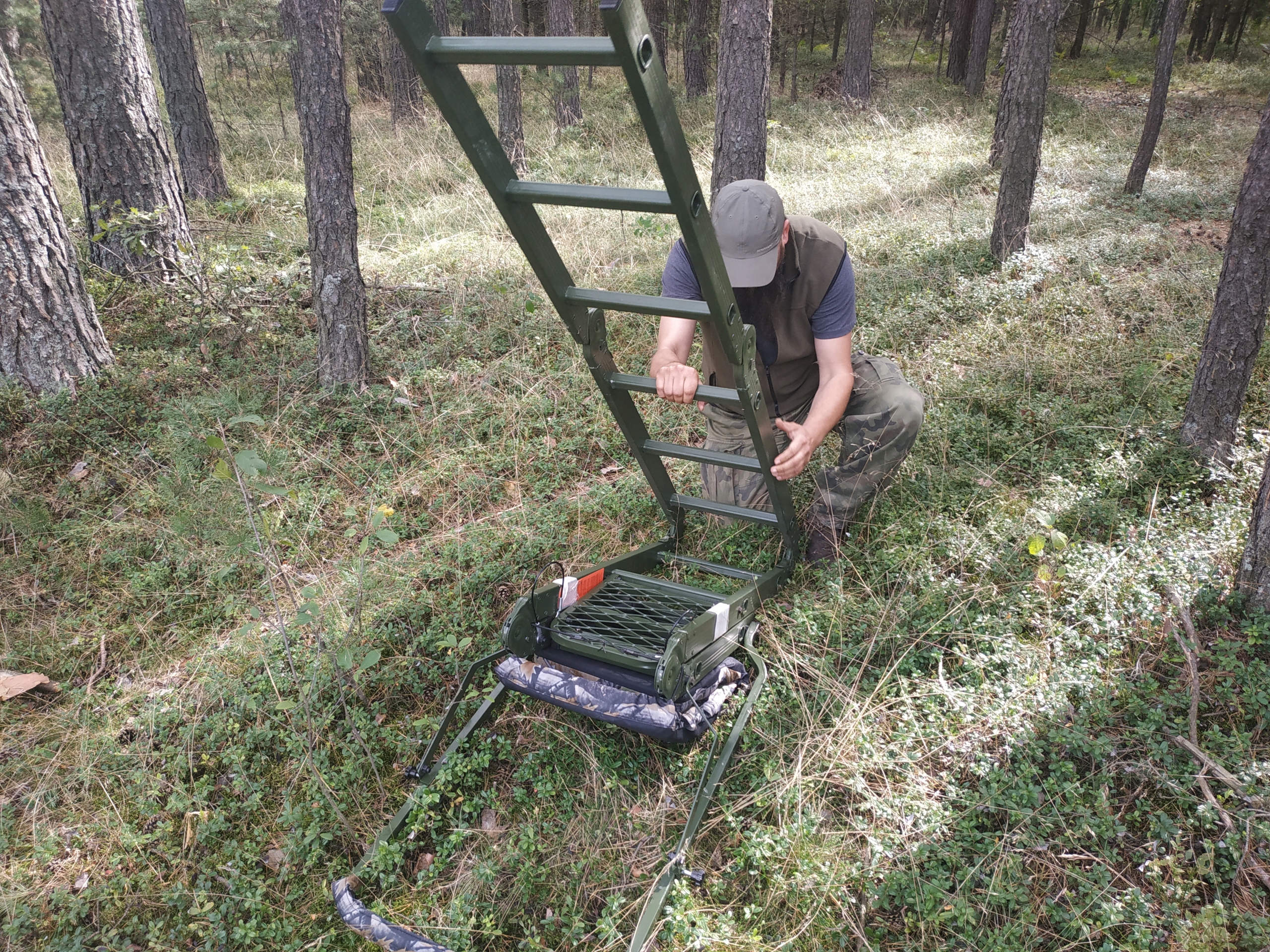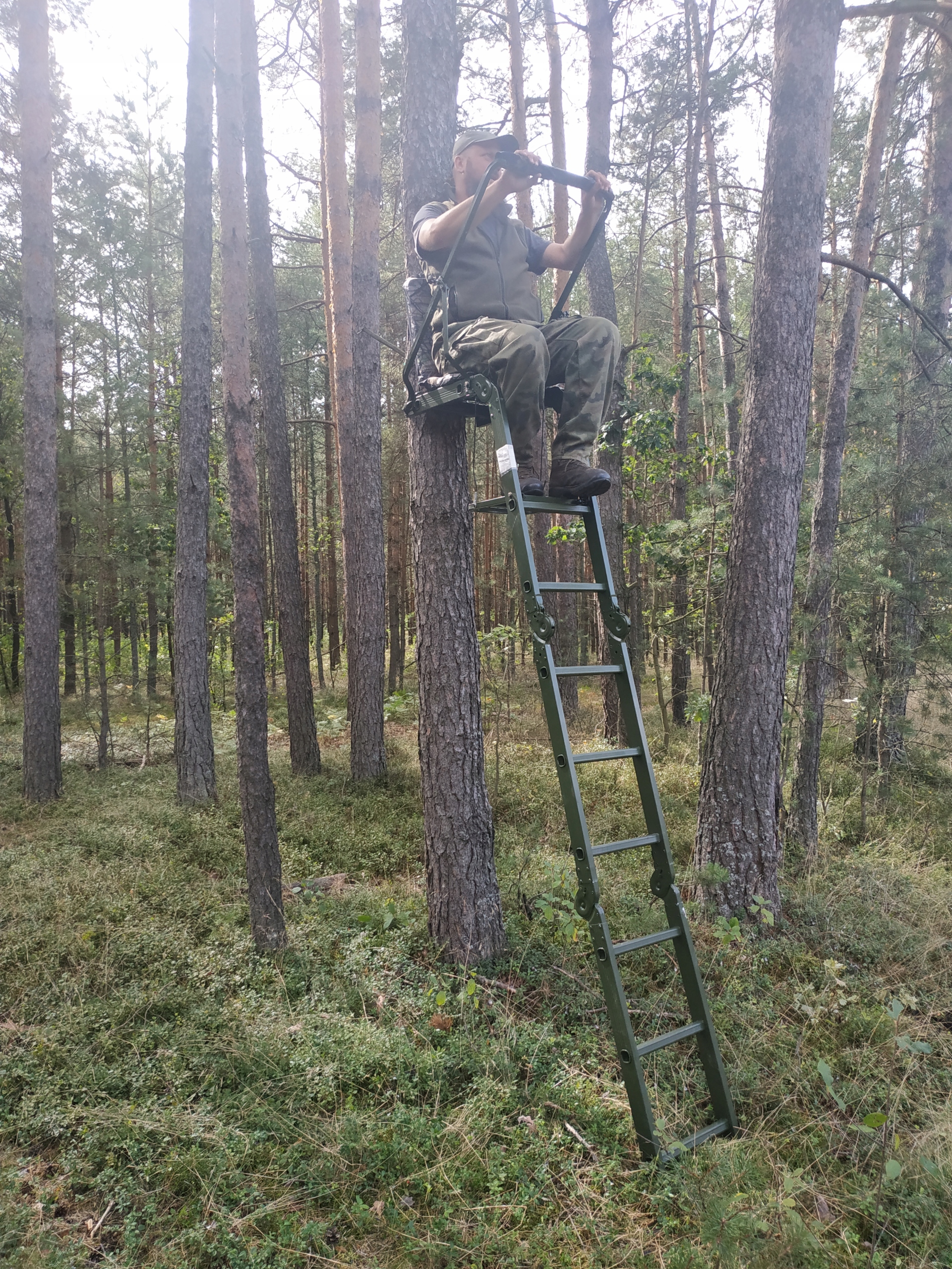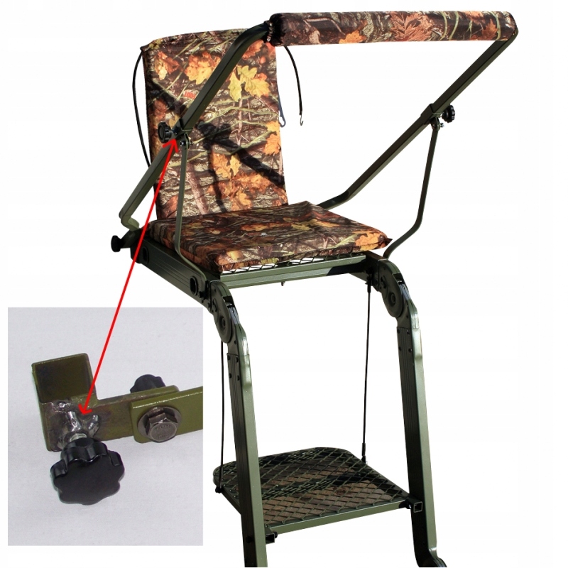 Практическая лестница с сиденьем и подставкой для оружия для охотников. Благодаря небольшому весу и складной конструкции его можно использовать буквально где угодно. Чрезвычайно устойчивая конструкция, поддерживаемая «зубцами», опирающимися на дерево, и дополнительными ремнями. Сиденье покрыто 100% полиэстером с мягкой губкой, материал камуфляжного цвета, нескользящая подставка для ног. Все покрашено зеленой антикоррозийной краской.