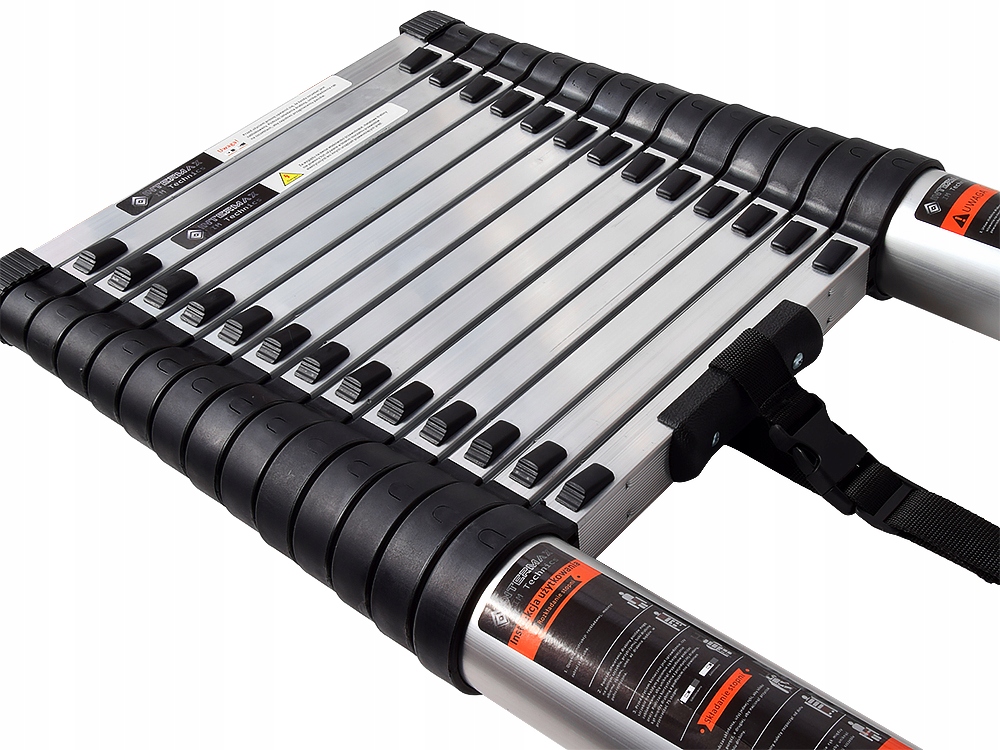 - Кроме того, лестница оснащена регулируемым ремнем с пряжкой, предотвращающей автоматическое открывание при транспортировке, и прорезиненными колпачками на ножки, чтобы лестница не скользила.