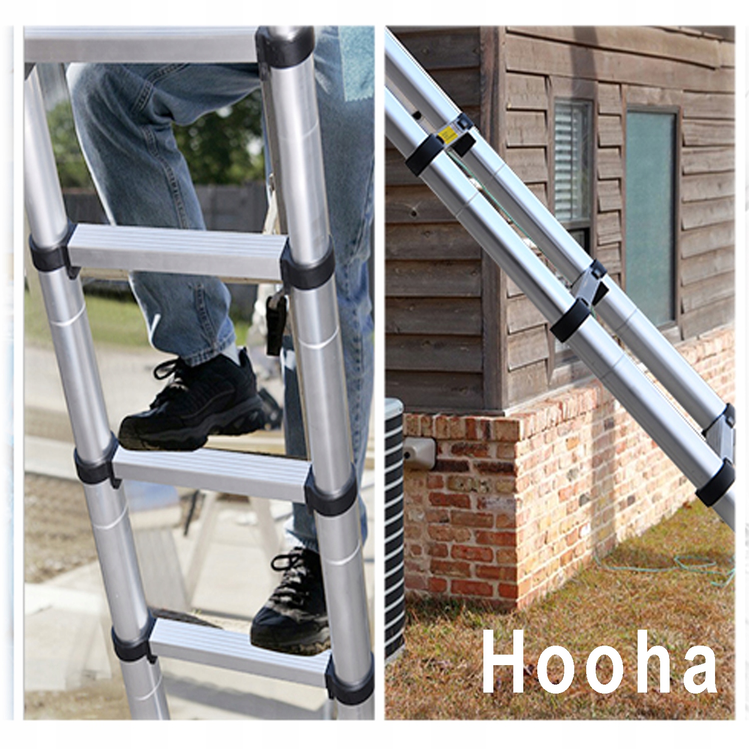 Изготовленная из высококачественного алюминиевого сплава прочная телескопическая рама лестницы устойчива к износу, коррозии, высоким и низким температурам, старению и выдерживает нагрузку до 150 кг. Телескопические лестницы Hooha, оснащенные нескользящими резиновыми амортизаторами, позволяют безопасно и без проблем использовать наши лестницы, даже перелезая через проволочные ограждения, стволы деревьев или другие изогнутые поверхности, и подходят для любого стиля дома или работы на месте.