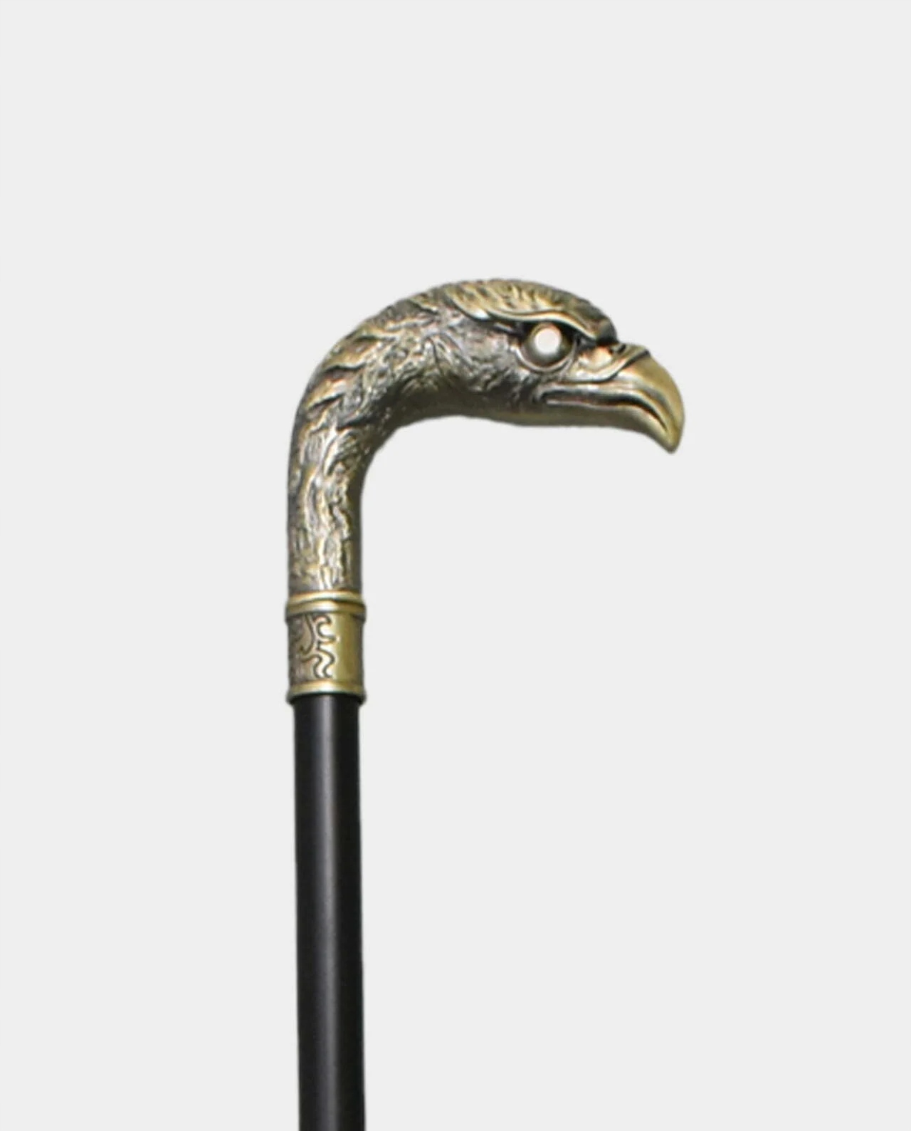 Трость с ручкой в виде головы орла. Эта красивая и оригинальная трость полностью изготовлена из алюминия. Стержень трости изготовлен из алюминия, покрыт элегантным черным лаком и дополнен резиновой ножкой. Ручка в форме декоративной скульптуры изготовлена из алюминия цвета старого золота. Трость можно открутить и сложить пополам, что очень удобно в путешествии.