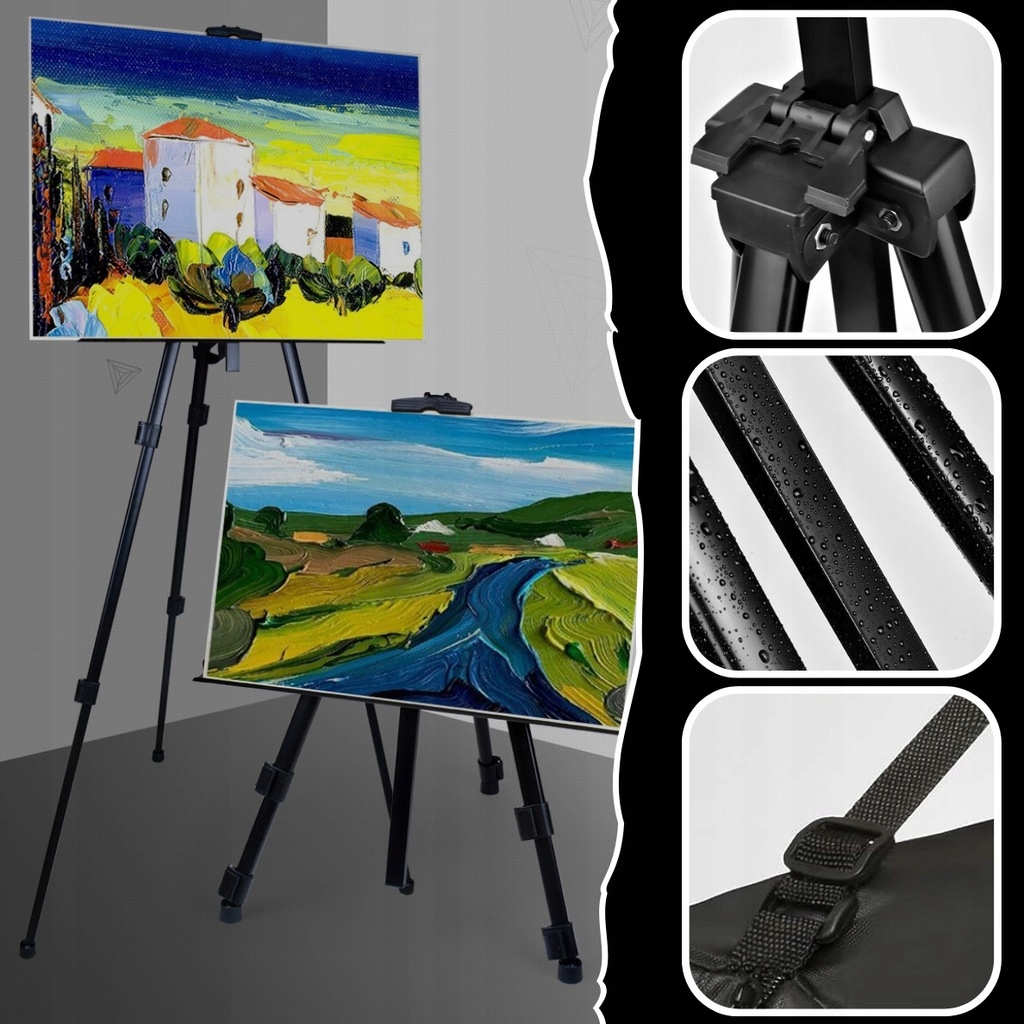 Устойчивость: Самовыравнивающиеся нескользящие ножки обеспечивают устойчивость даже на неровной поверхности. Это означает, что вы можете работать на открытом воздухе, не беспокоясь о том, что мольберт сдвинется или трясется холст.