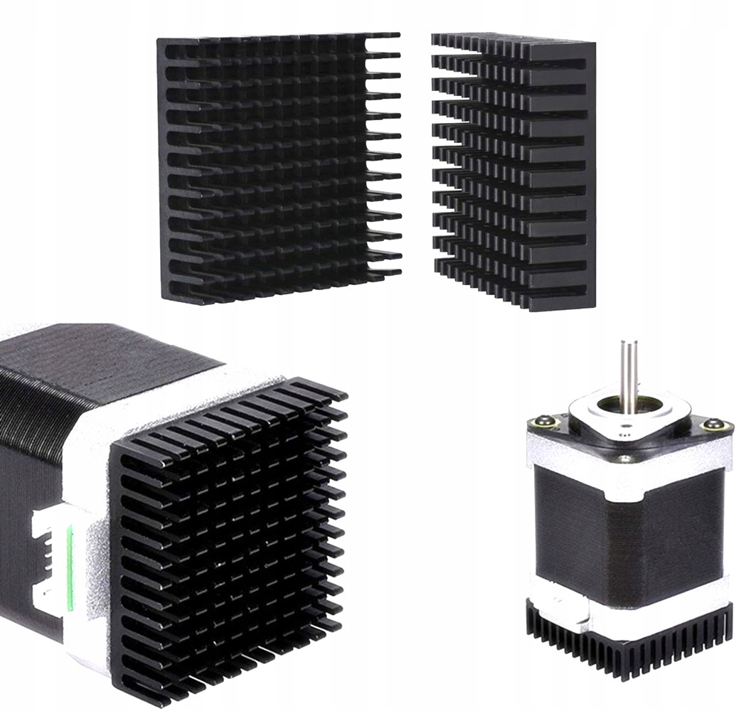 Алюминиевые радиаторы (окрашенные в черный матовый цвет), предназначенные для охлаждения шаговых двигателей в 3D-принтерах, интегральных схемах компьютерных плат и т. д.