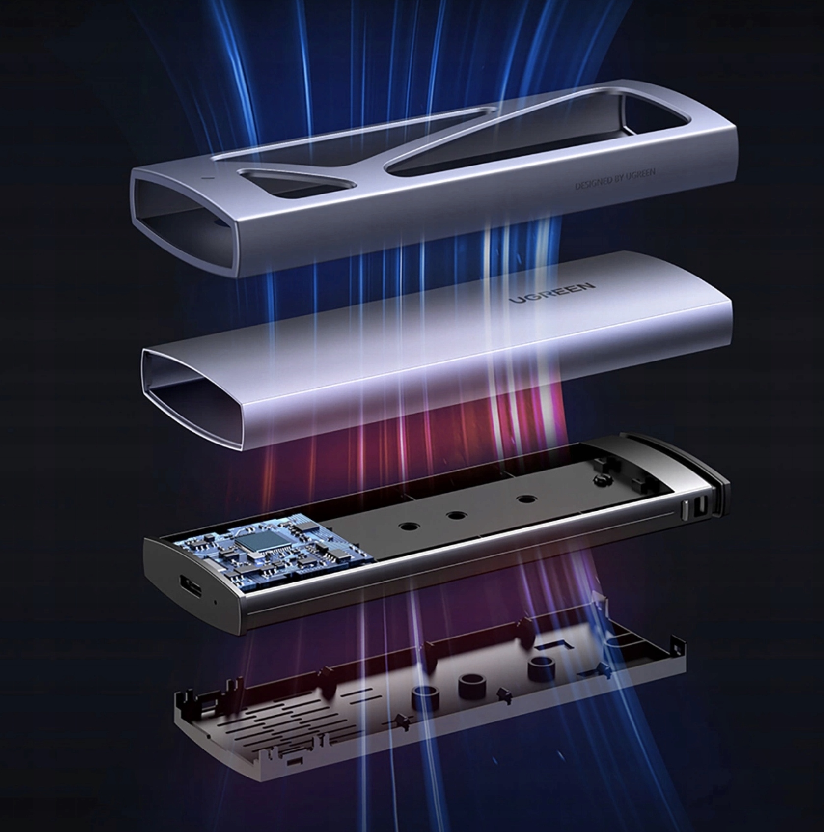 ➡️ Корпус Ugreen CM578, изготовленный из высококачественного алюминия, эффективно рассеивает тепло, защищая накопитель от перегрева. Благодаря этому вы можете наслаждаться бесперебойной работой даже во время интенсивных сеансов. Он выглядит элегантно и надежно работает.