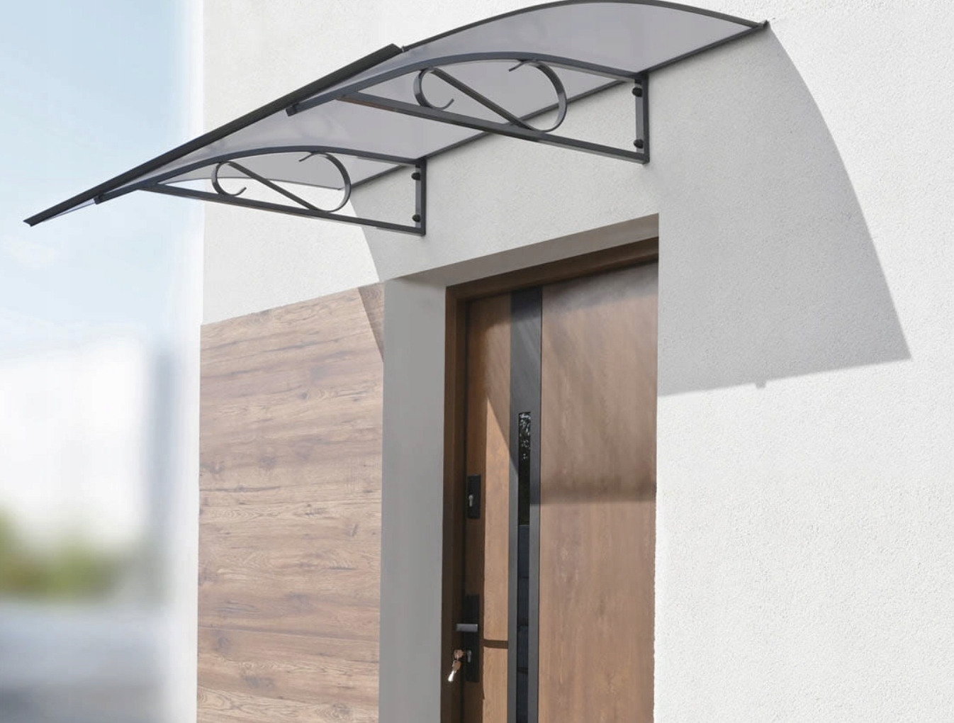 Навес имеет два дополнительных элегантных кронштейна, которые не только увеличивают долговечность навеса, но и добавляют ему шарма.