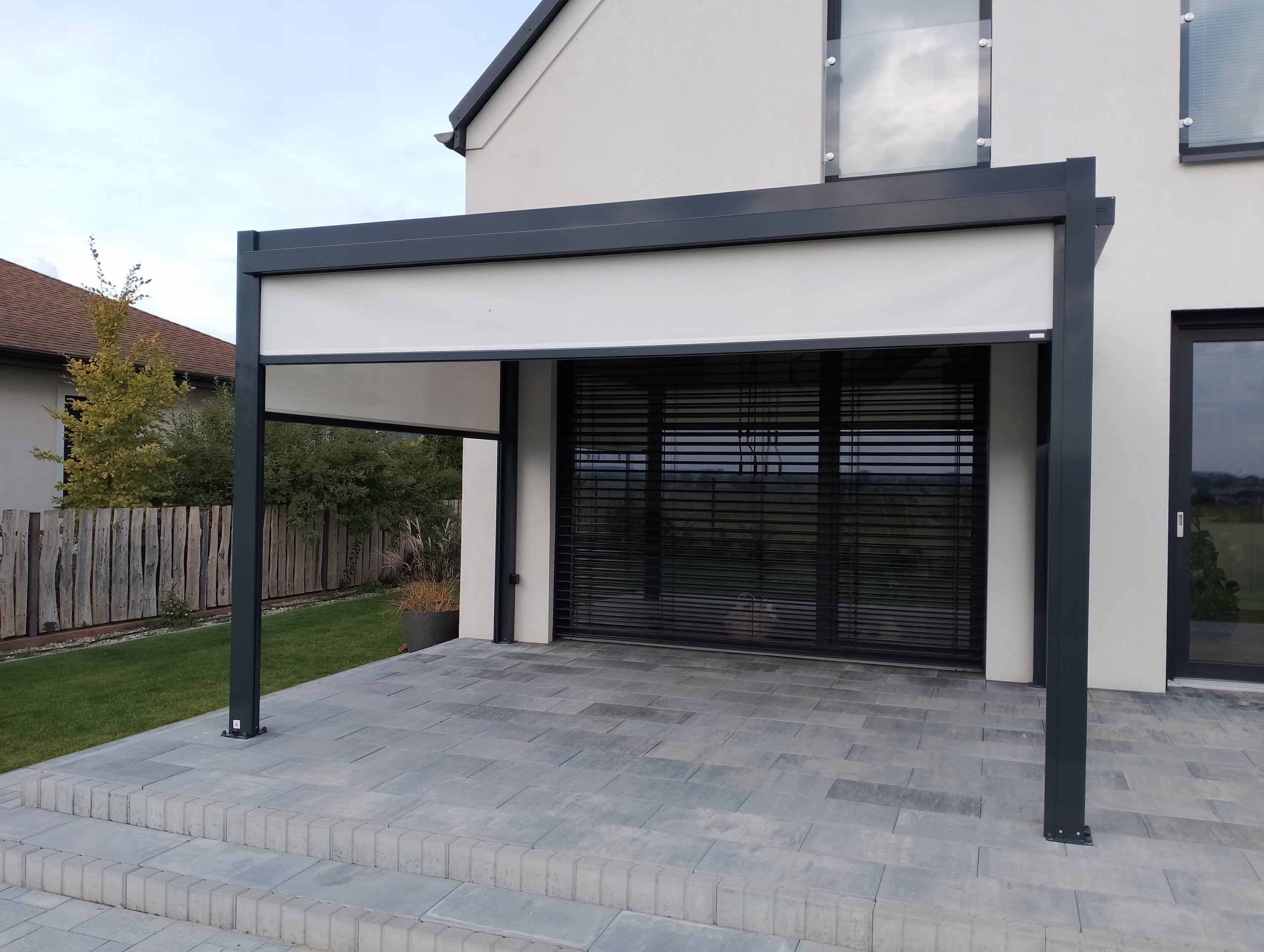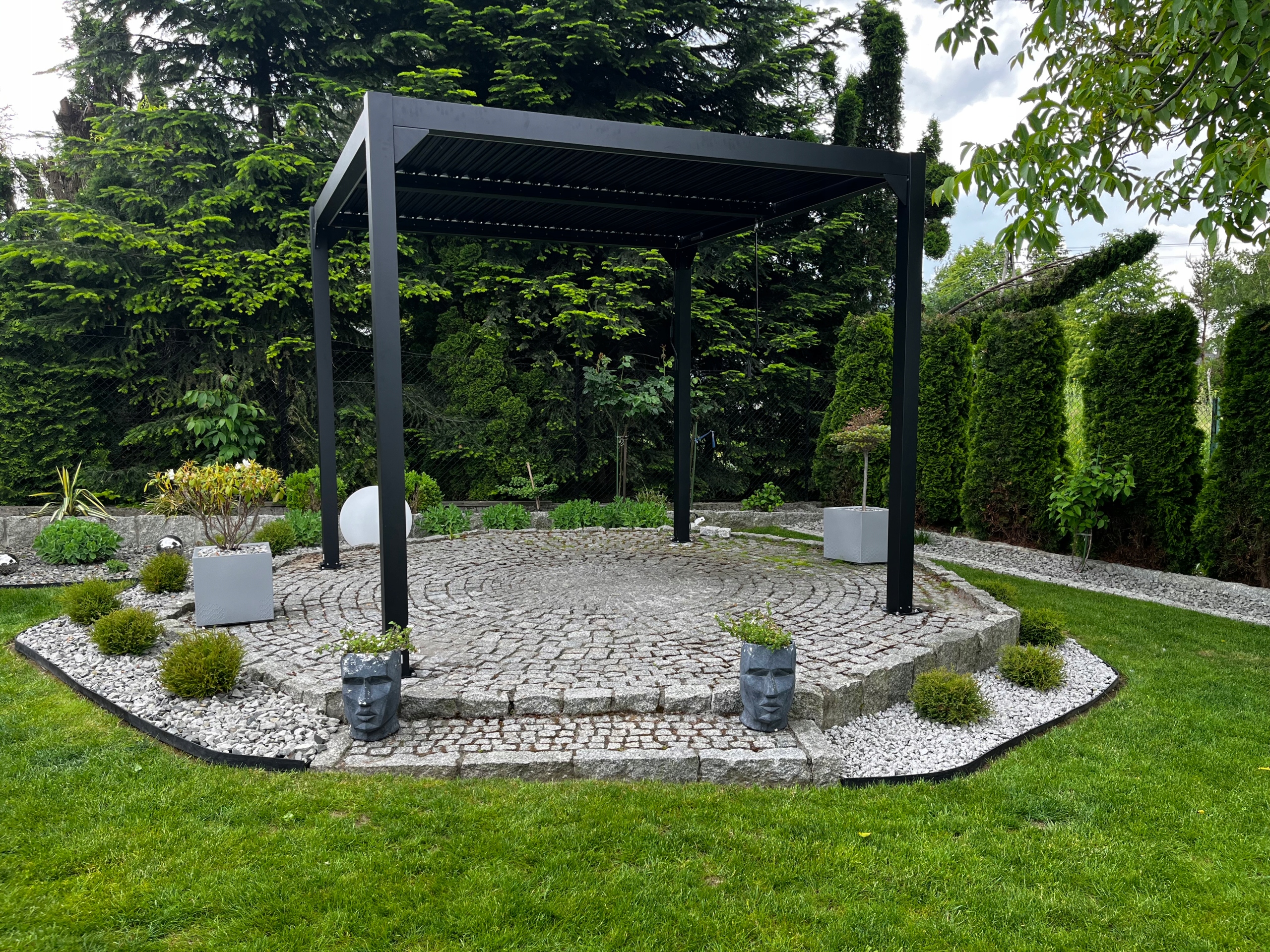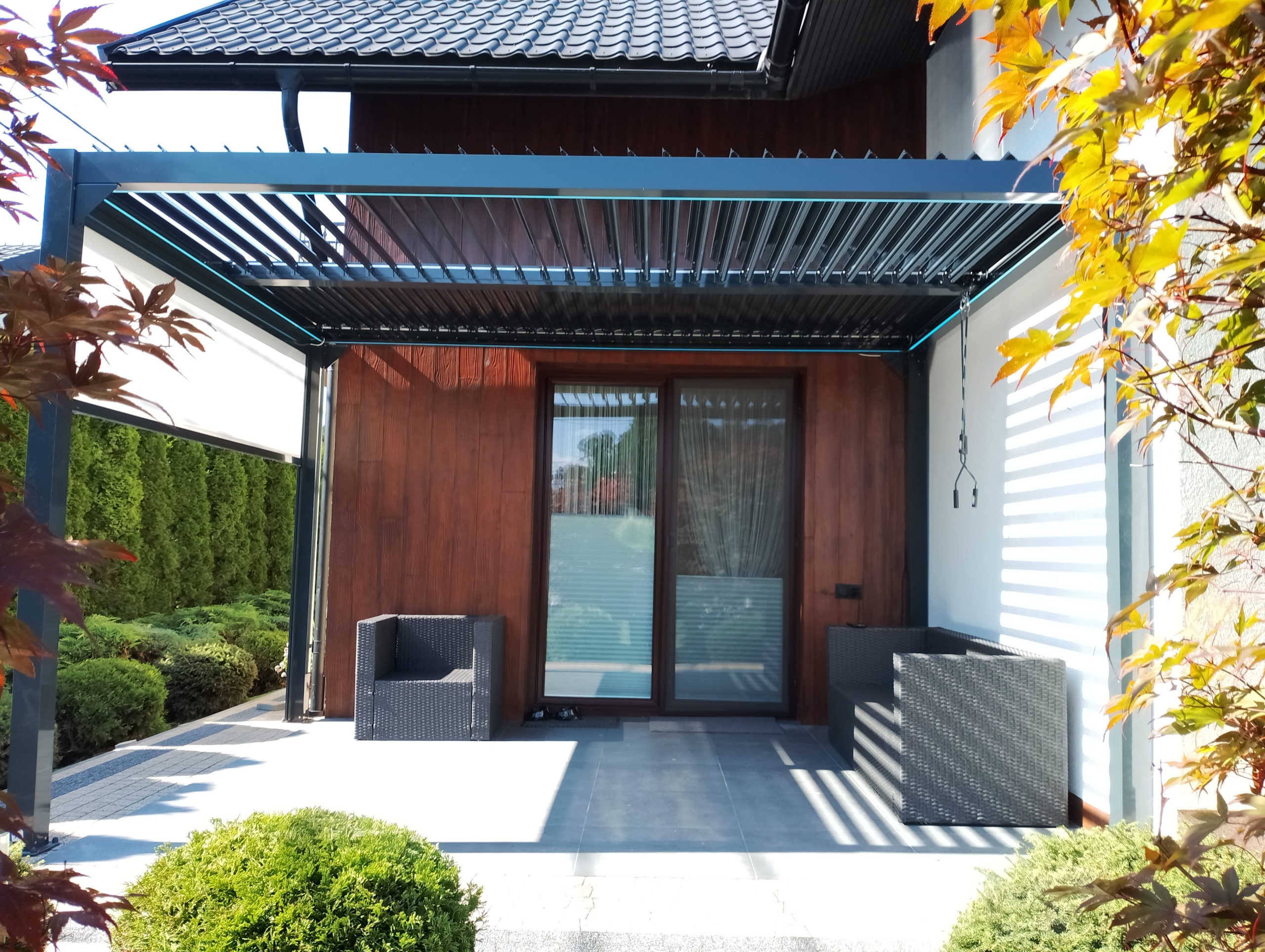 - Pergola имеет алюминиевую крышу (слепой) с возможностью регулировки угла ламеллов.