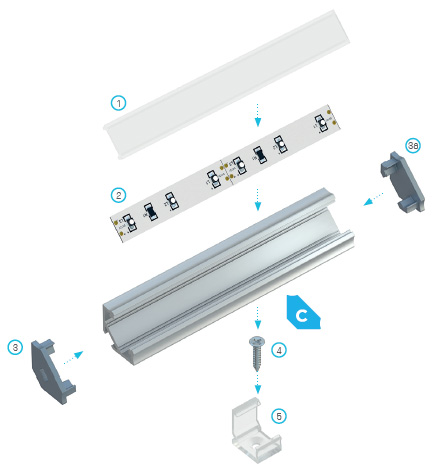 - Примечания: Не установите светодиодные ленты IP65 в Профиль с установленным абажур. Такая сборка может повредить установленную светодиодную полосу и абажур, а также потерю гарантии