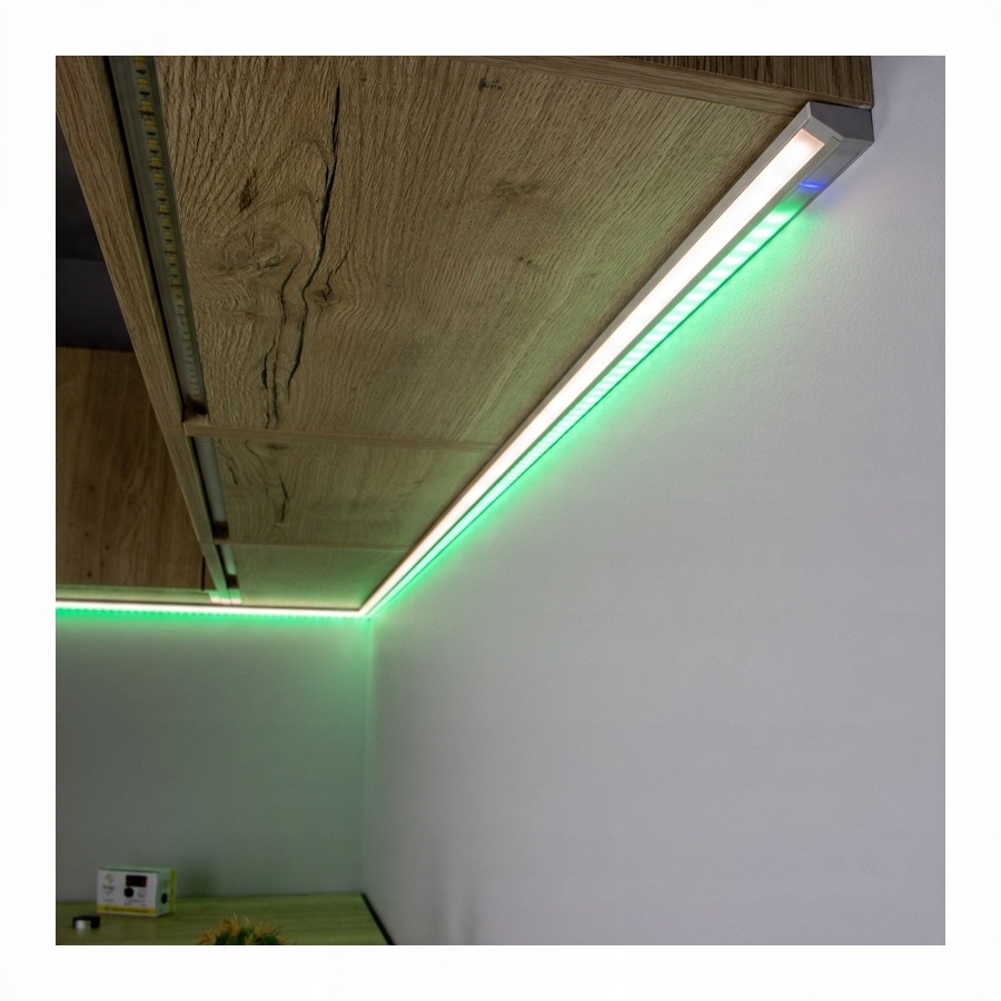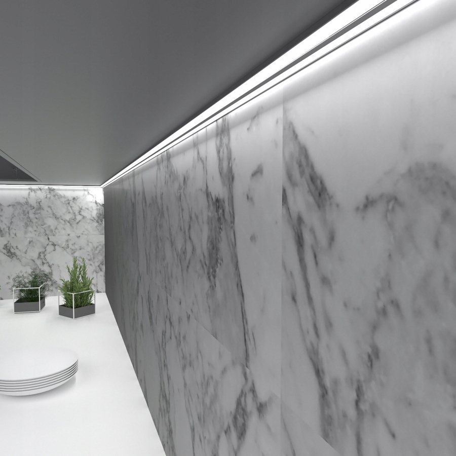 NEOLINE — это поверхностный профиль, к которому можно приклеить две светодиодные ленты, светящиеся в разные стороны. Идеально подходит для освещения под шкафом, например, на кухне. Благодаря тому, что он светит под углом, мы получаем эффект идеально распределенного света. Одна линия освещает столешницу, а другая – украшения на стене (модный декор из плитки или другая графика).