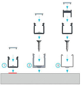 Окончательный результат монтажа Y-профиля с крышкой BASIC с использованием (1) двусторонней ленты, (2) монтажного кронштейна Y, (3) вспомогательного профиля Y M1 и металлического кронштейна Y