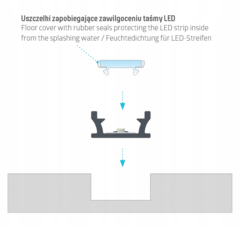 Профиль TERRA, благодаря своей водонепроницаемости, идеально подходит для использования в ванных комнатах или там, где нам необходимо защитить ленту от влаги. Его можно использовать в душевых кабинах, в качестве напольного или потолочного освещения, на полках, полках в ванной комнате и для подсветки зеркала. Этот профиль также подходит для наружного применения на подъездных дорогах, потолочных перекрытиях, наружных лестницах и террасах. Благодаря уплотнительной крышке, которая предотвращает намокание светодиодной ленты.