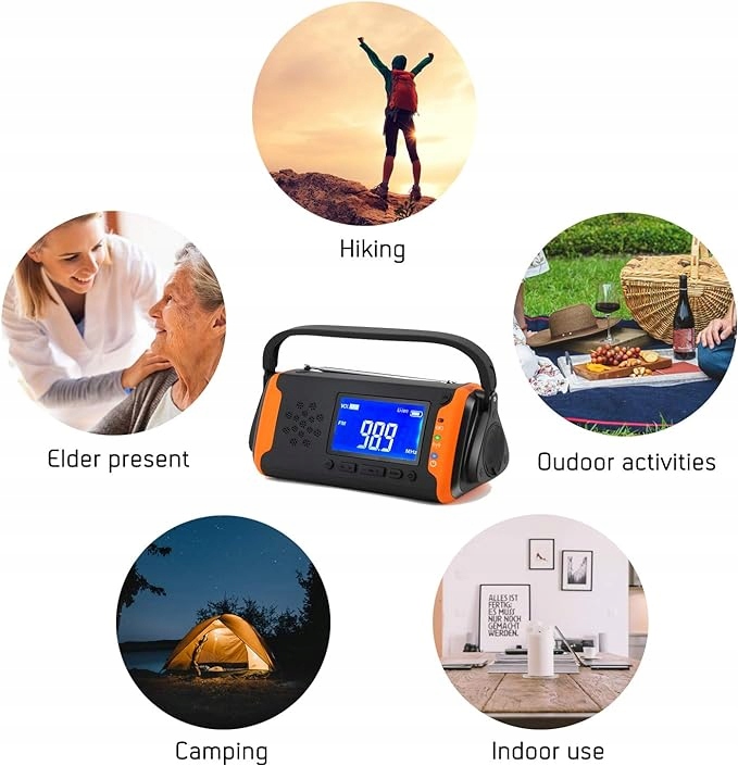 Идеально подходит для активного отдыха — это новое радио с солнечной батареей и встроенной батареей емкостью 4000 мАч в качестве блока питания предлагает диапазон частот AM / FM, светодиодный фонарик, воспроизведение музыки через AUX и функцию SOS-будильника. Идеально подходит для использования в помещении и на открытом воздухе.