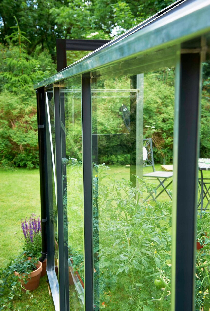 двойной, горизонтально разделенные двери установлены спереди и обеспечивают легкий ввод. Дверная ручка устойчива к ржавчине и оснащена встроенным замком. Двери и окна всегда черные независимо от цвета структуры. Теплица оснащена широкими желобами и канализационными подразделениями.