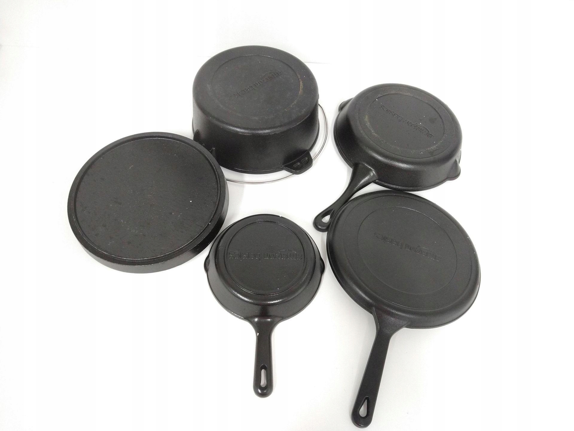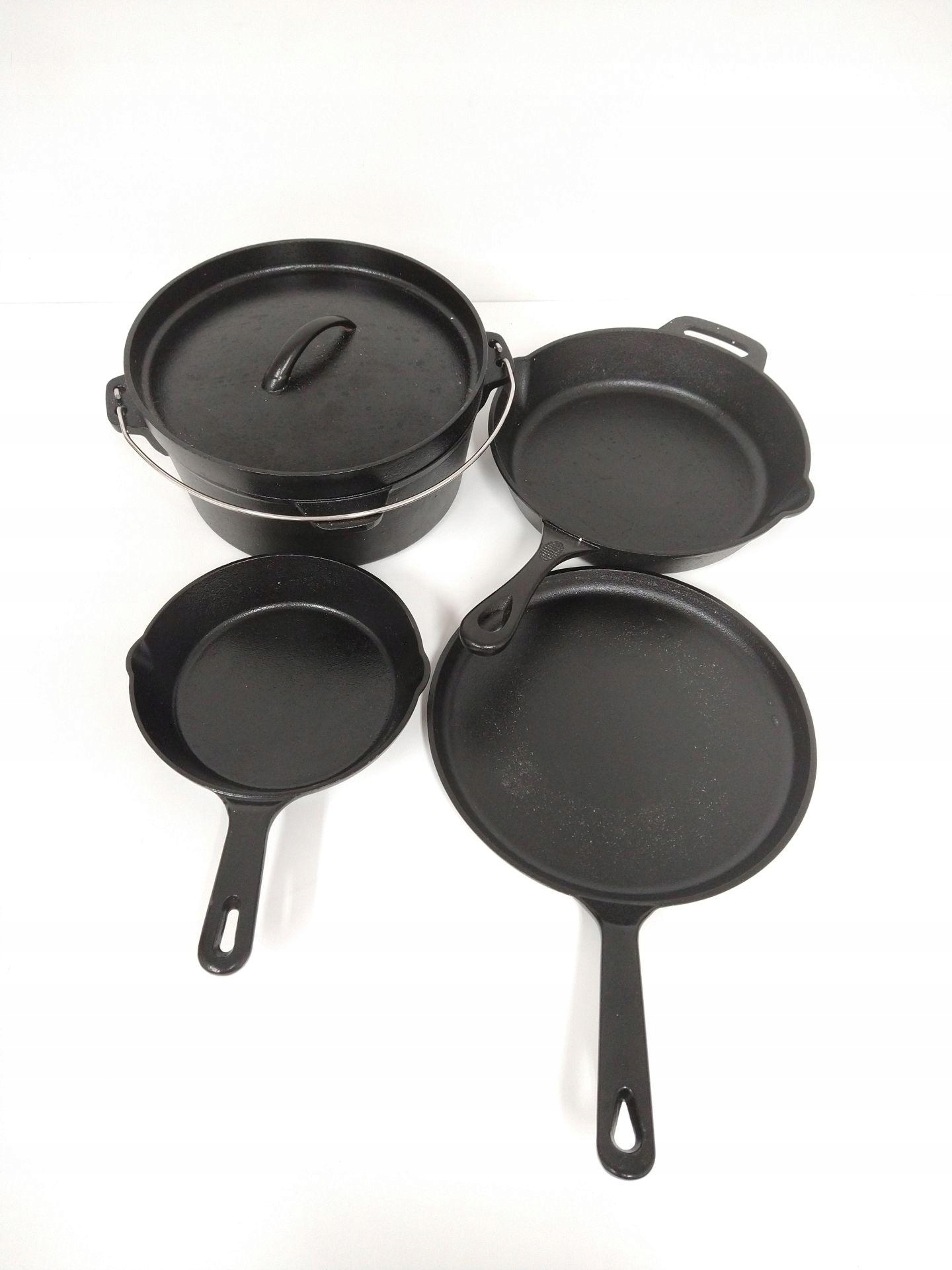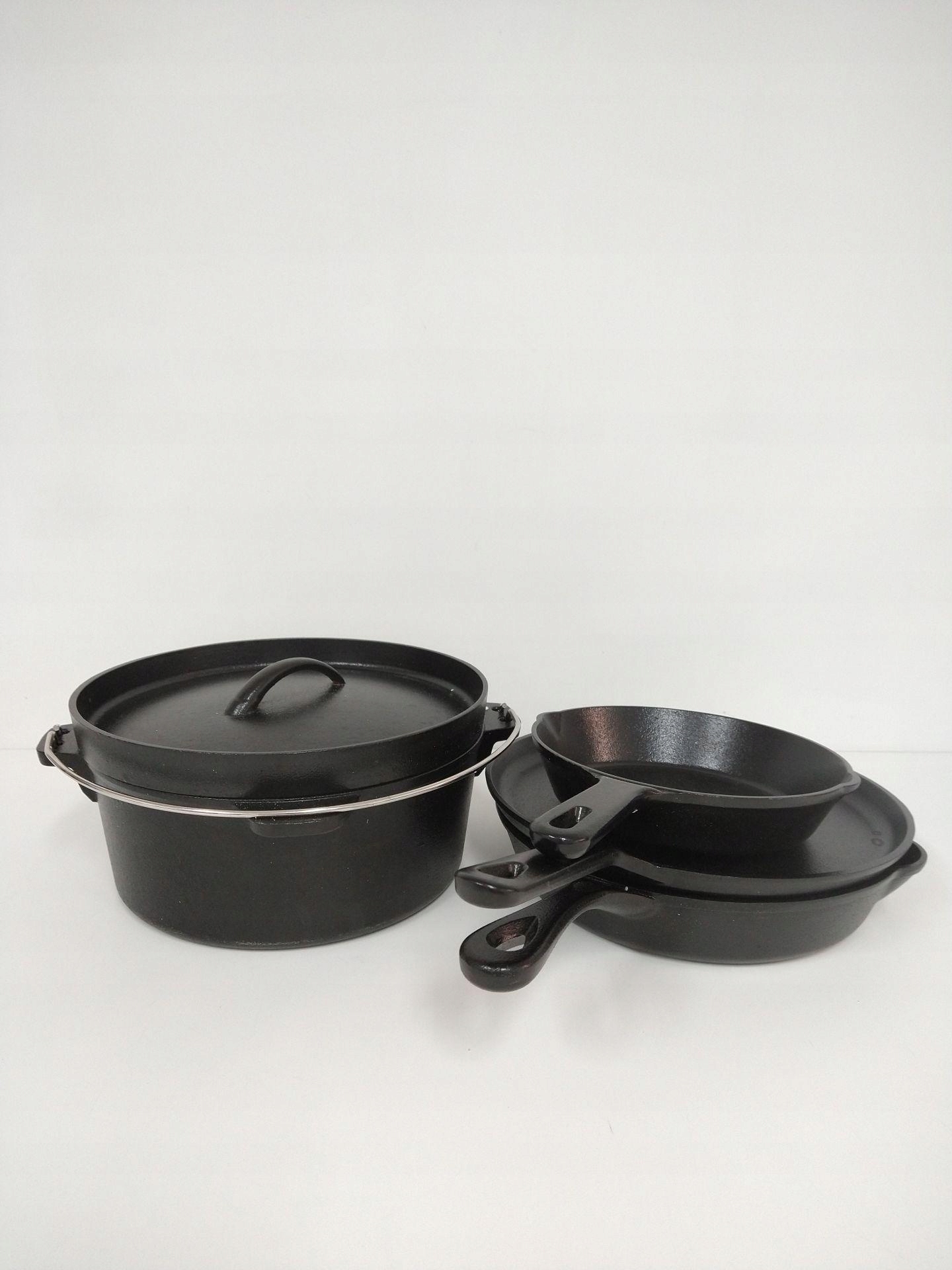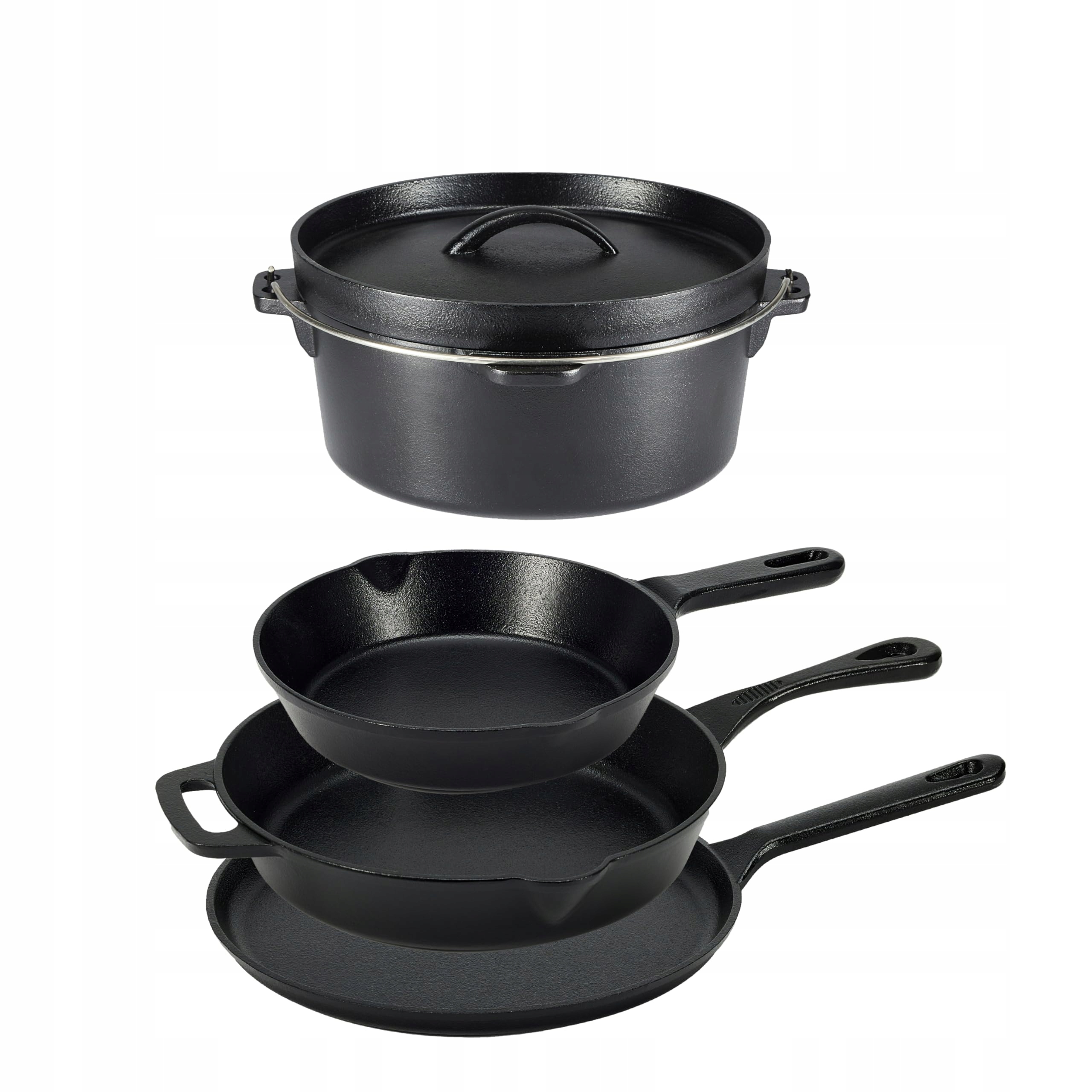 5-часовая кухонная посуда, сделанная из опытного и готового к использованию чугуна; Он содержит 10,5 -дюймовую сковороду, 8 -кишковую кастрюлю, 10,5 -дюймовую кастрюлю и голландскую 10,5 -дюймовую печь с крышкой