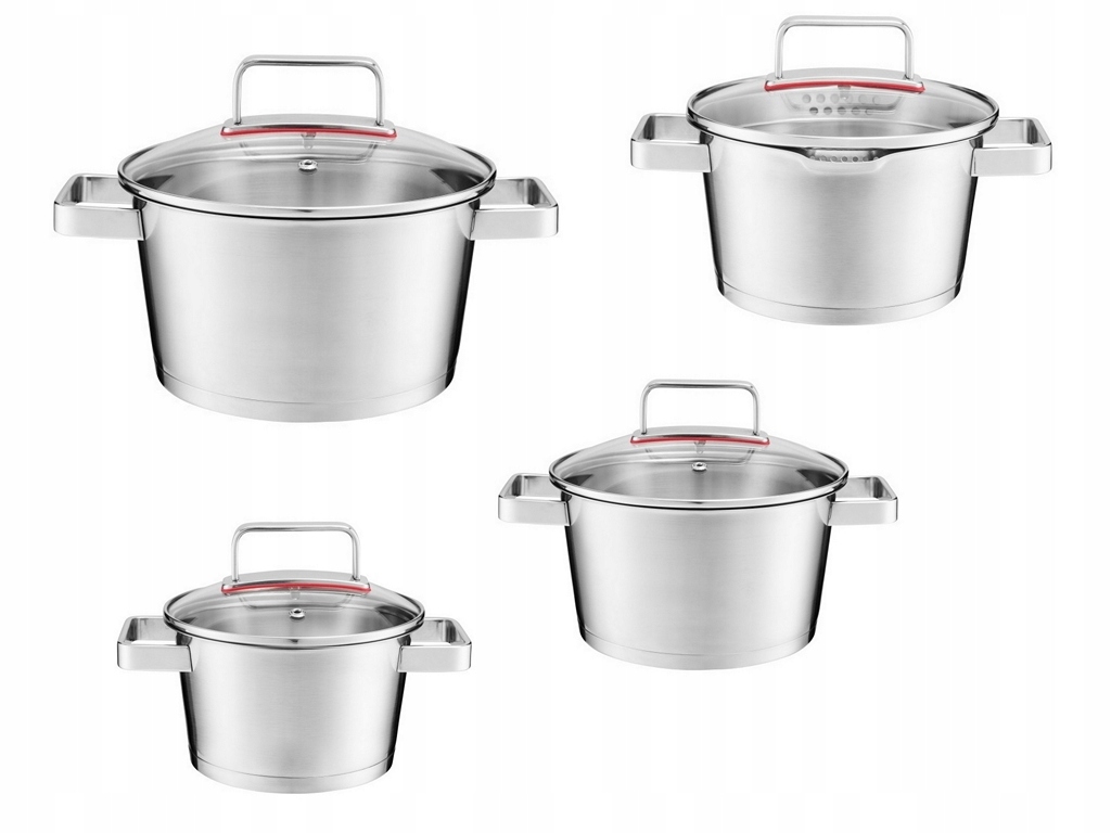 - Толщина стенки составляет 0,7 мм, что позволяет сохранить тепло дольше. Выборные горшки имеют трехслойное дно (сталь - алюминий - сталь) толщиной 5,7 мм, благодаря которого тепло, накопленное во время нагрева, равномерно распространяется по нему. Это ускоряет приготовление пищи, экономия времени и, следовательно, потребление газа и электричества. Многослойное дно также позволяет сохранить температуру после приготовления. Горшок на внутренней стене имеет обозначение емкости, он помогает измерять правильное количество жидкости. Крышки сделаны из закаленного стекла. Они имеют силиконовую подушку между стеклом крышки и ручкой. Он защищает крышку крышки от отопления во время приготовления.