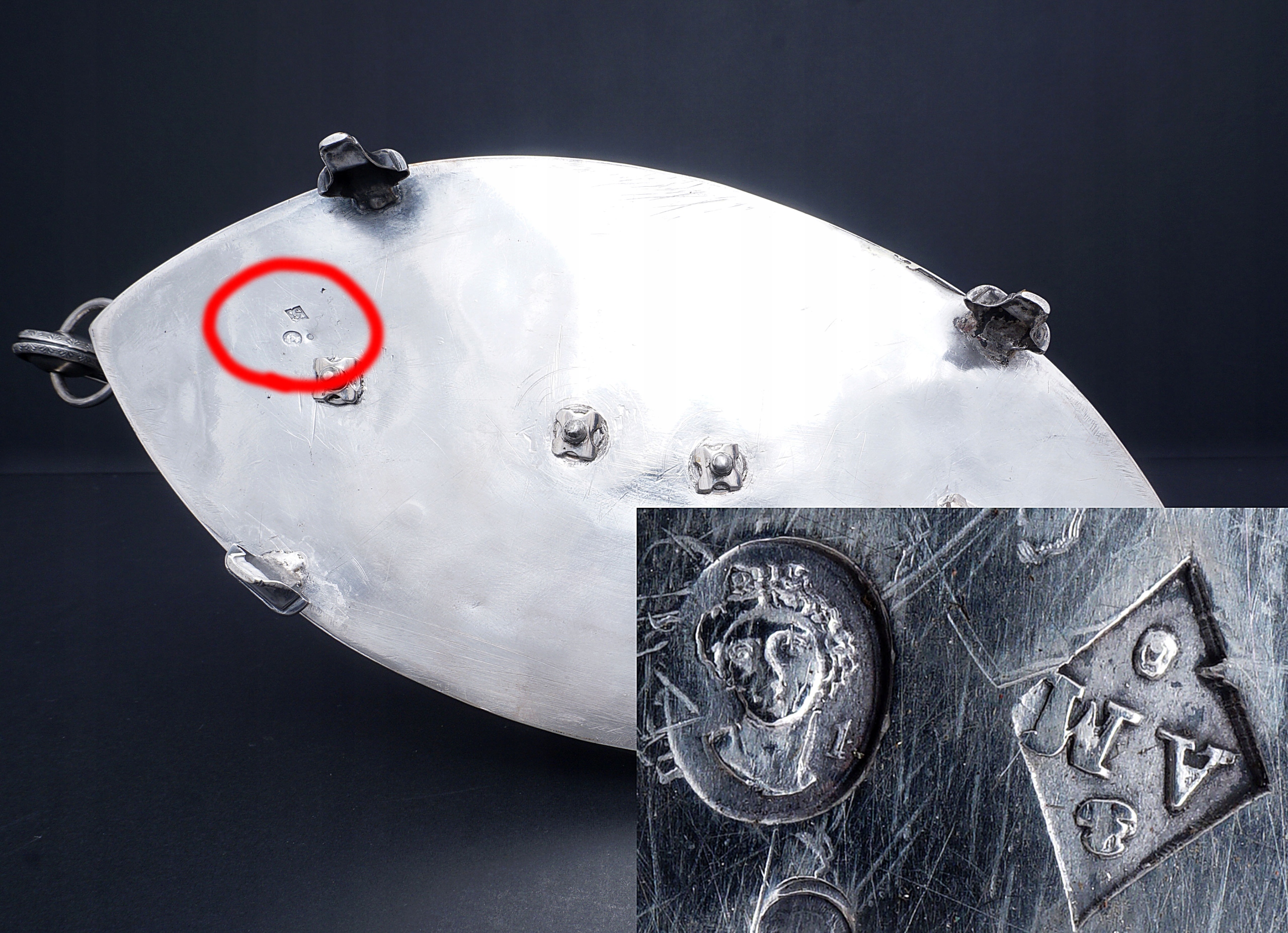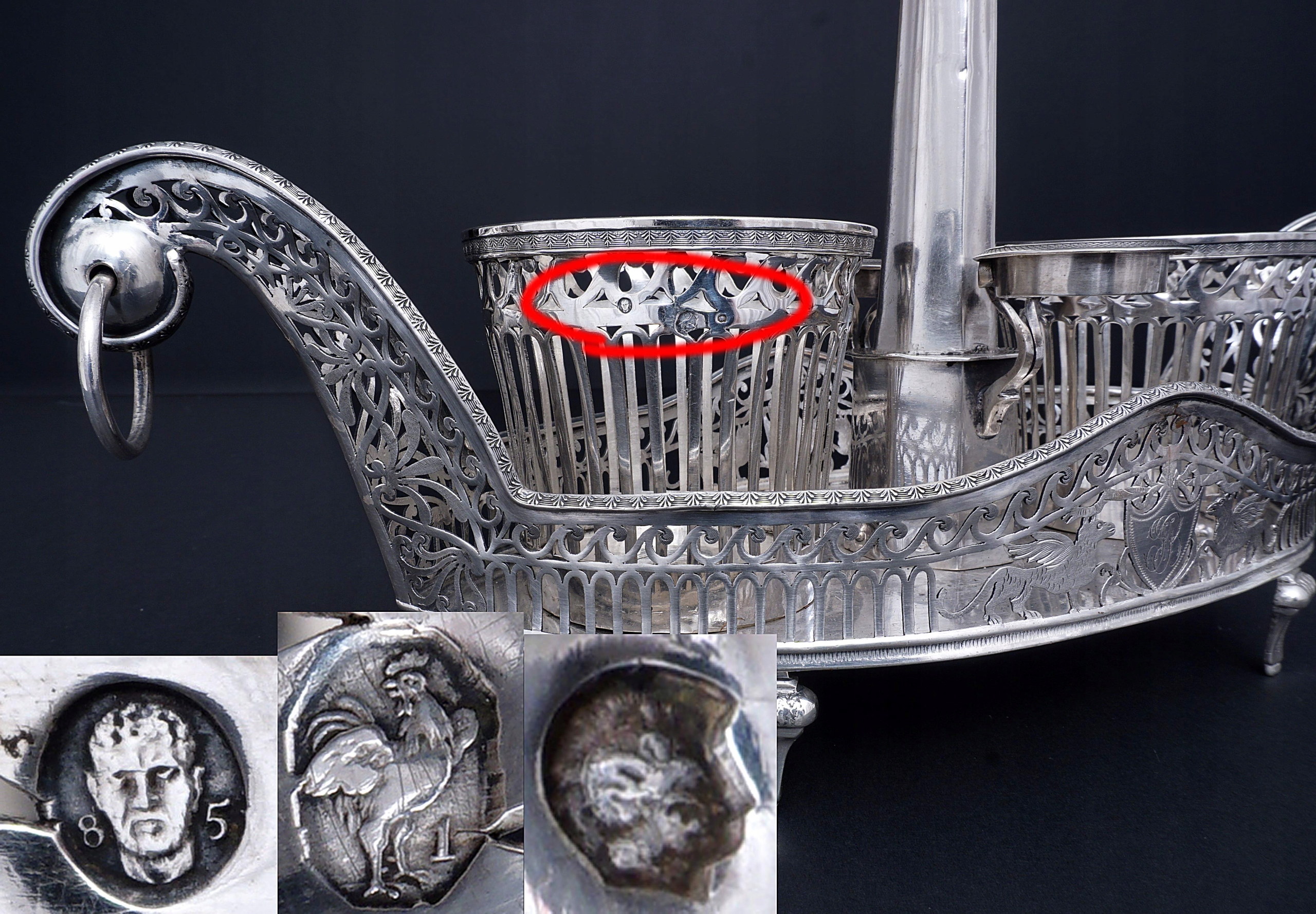 Клеймо - петух в восьмиугольнике с цифрой 1, Парижская гарантия и клеймо ювелира AM.