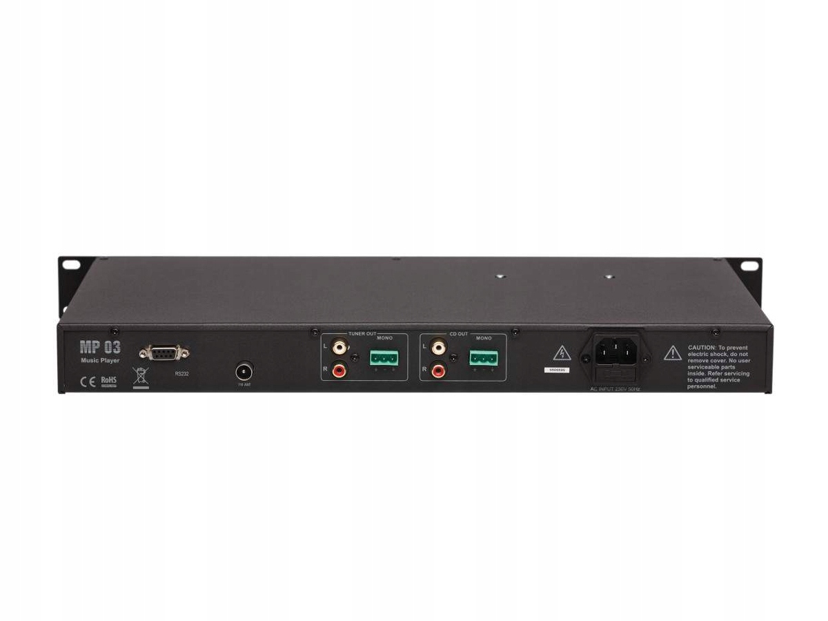 Музыкальный проигрыватель со встроенным проигрывателем компакт-дисков, FM-тюнером и устройством чтения USB/SD. MP 03 можно управлять с помощью пульта дистанционного управления, входящего в комплект каждого плеера. Он имеет два отдельных линейных входа: CD/USB/SD и FM-тюнер с поддержкой зоны 2. Также оснащен двумя балансными моновыходами, двумя разъемами Phoenix, несимметричными стереовыходами RCA и портом управления RS232.
